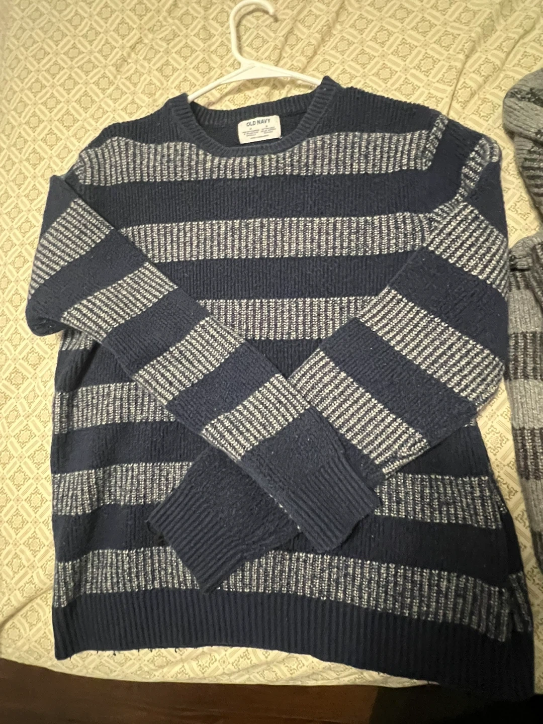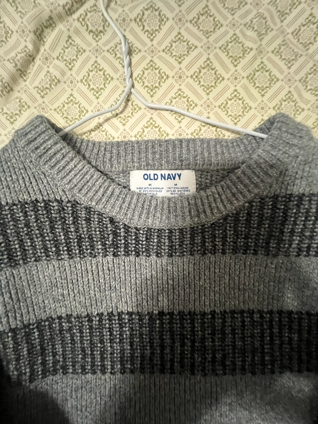 Two Old Navy sweaters with horizontal stripes. Made with a minimum of 30% recycled materials. Size is medium.