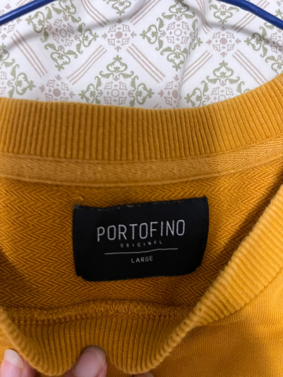 This Portofino Original sweatshirt is a comfy, mustard yellow pullover. It features an embroidered "BKLYN" graphic on the front and a "United States of America" crest detail. Size is large.