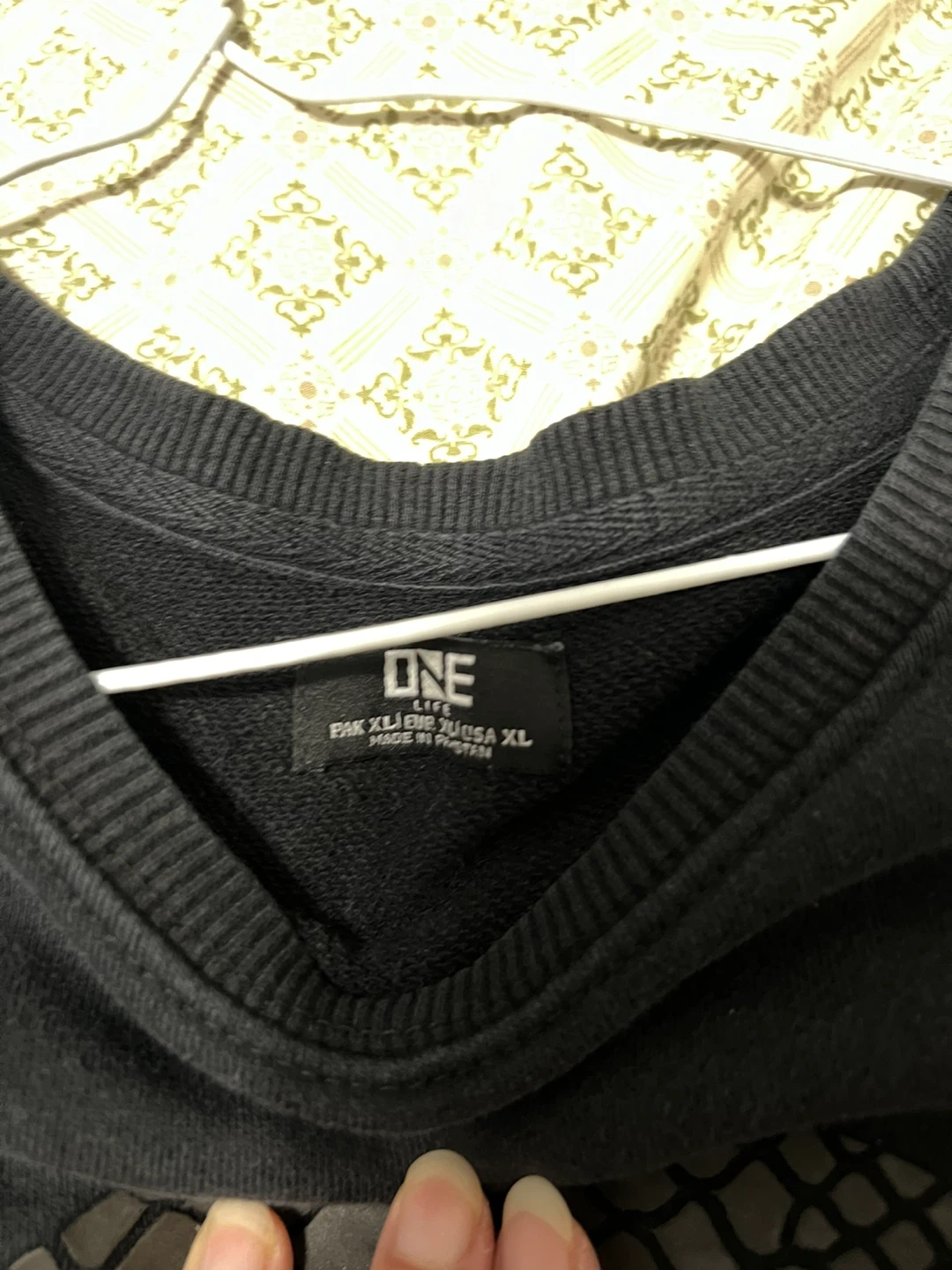 This black ONE LIFE sweatshirt features a large, textured skull graphic on the front. It's a size XL. Made in Pakistan.