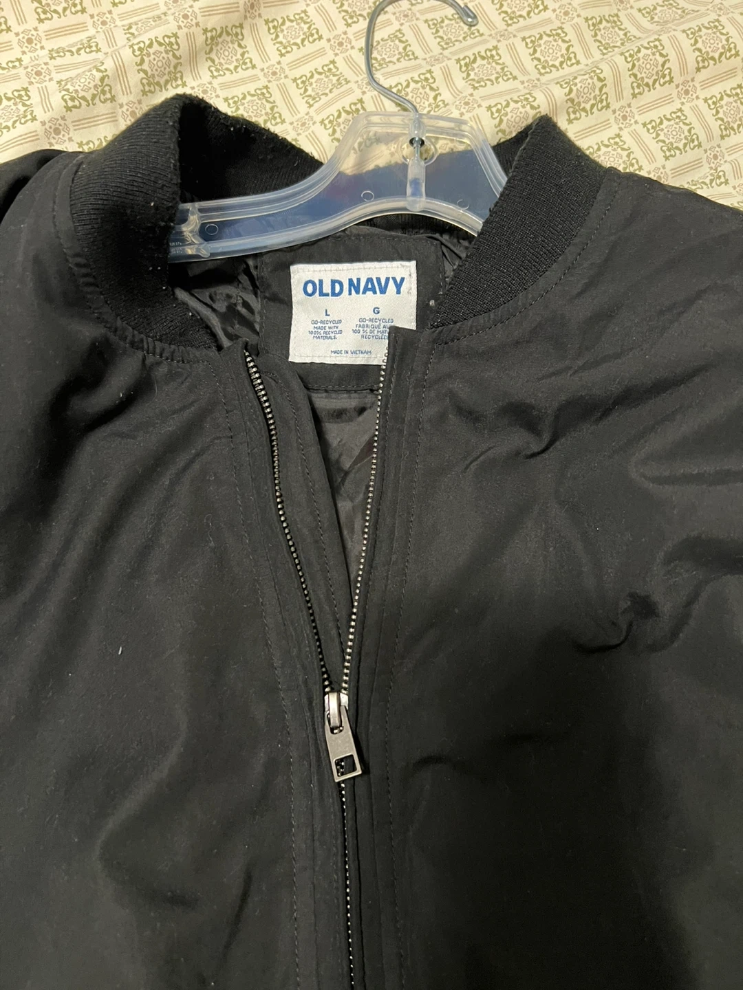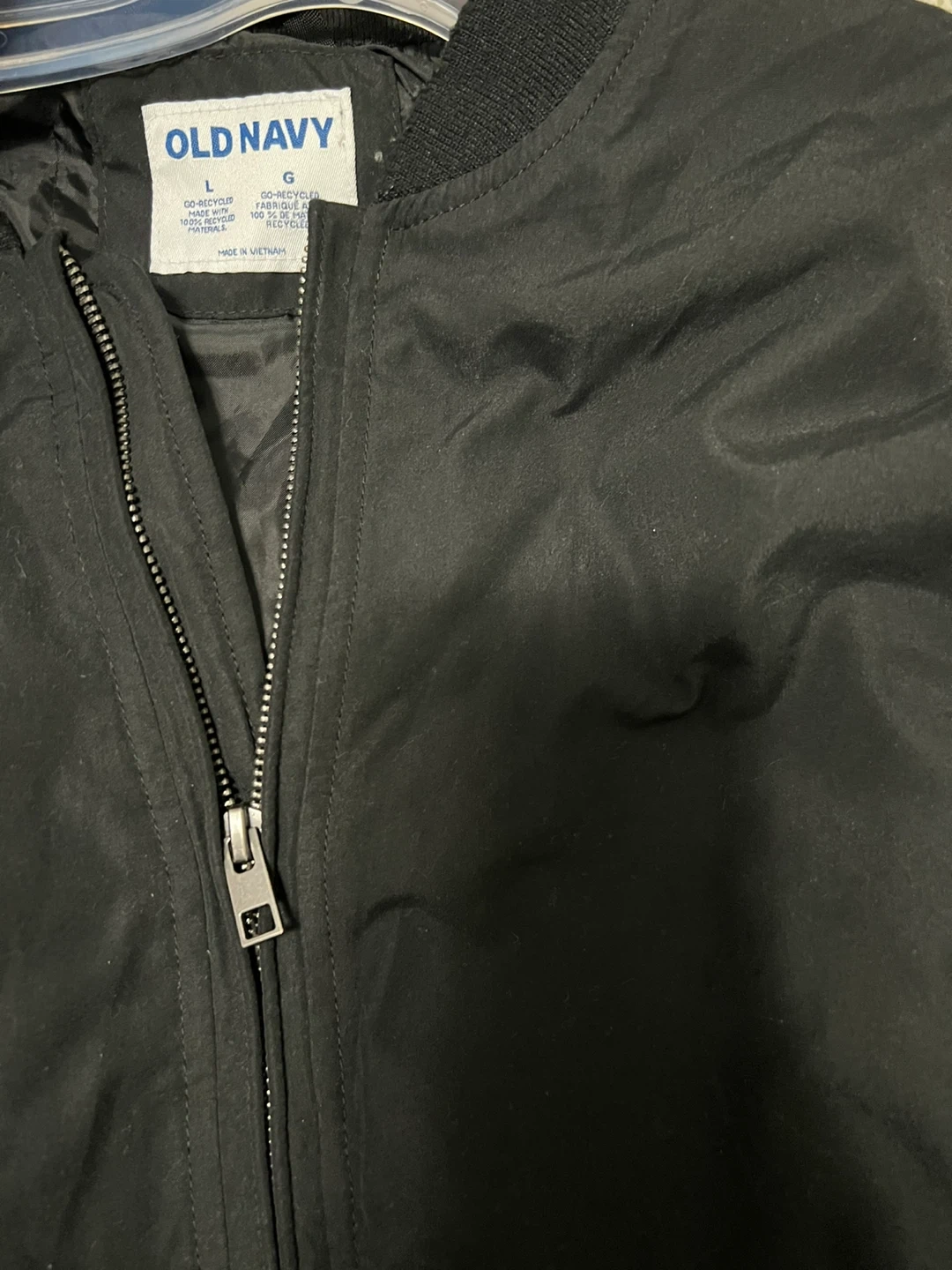 This is an Old Navy black bomber jacket in size Large. It's made with recycled materials. The jacket zips up the front.