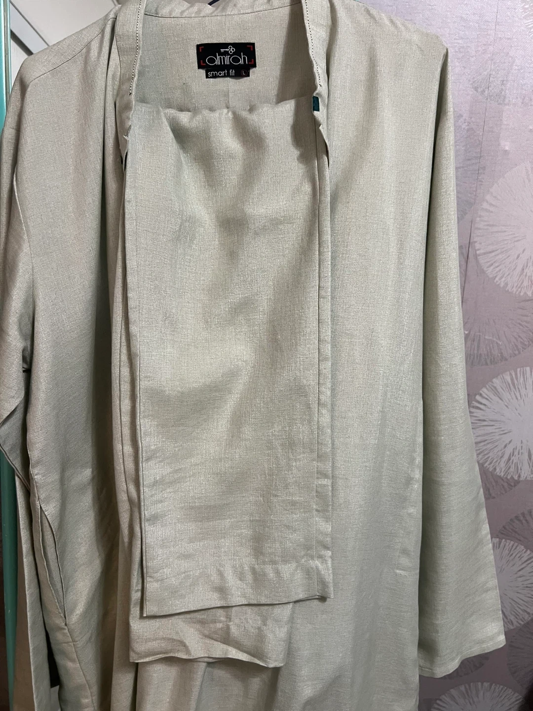 This is a men's kurta from Almirah in a light grey colour. It's a size L with a smart fit and has a band collar with button detailing. The material appears to be a linen blend.
