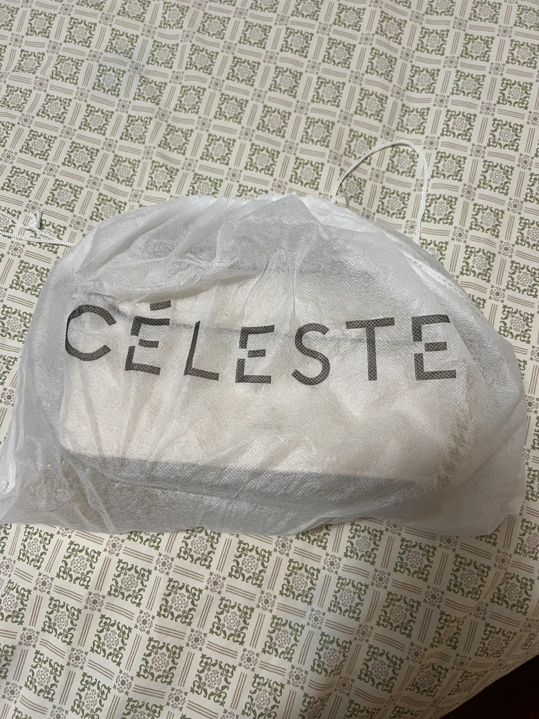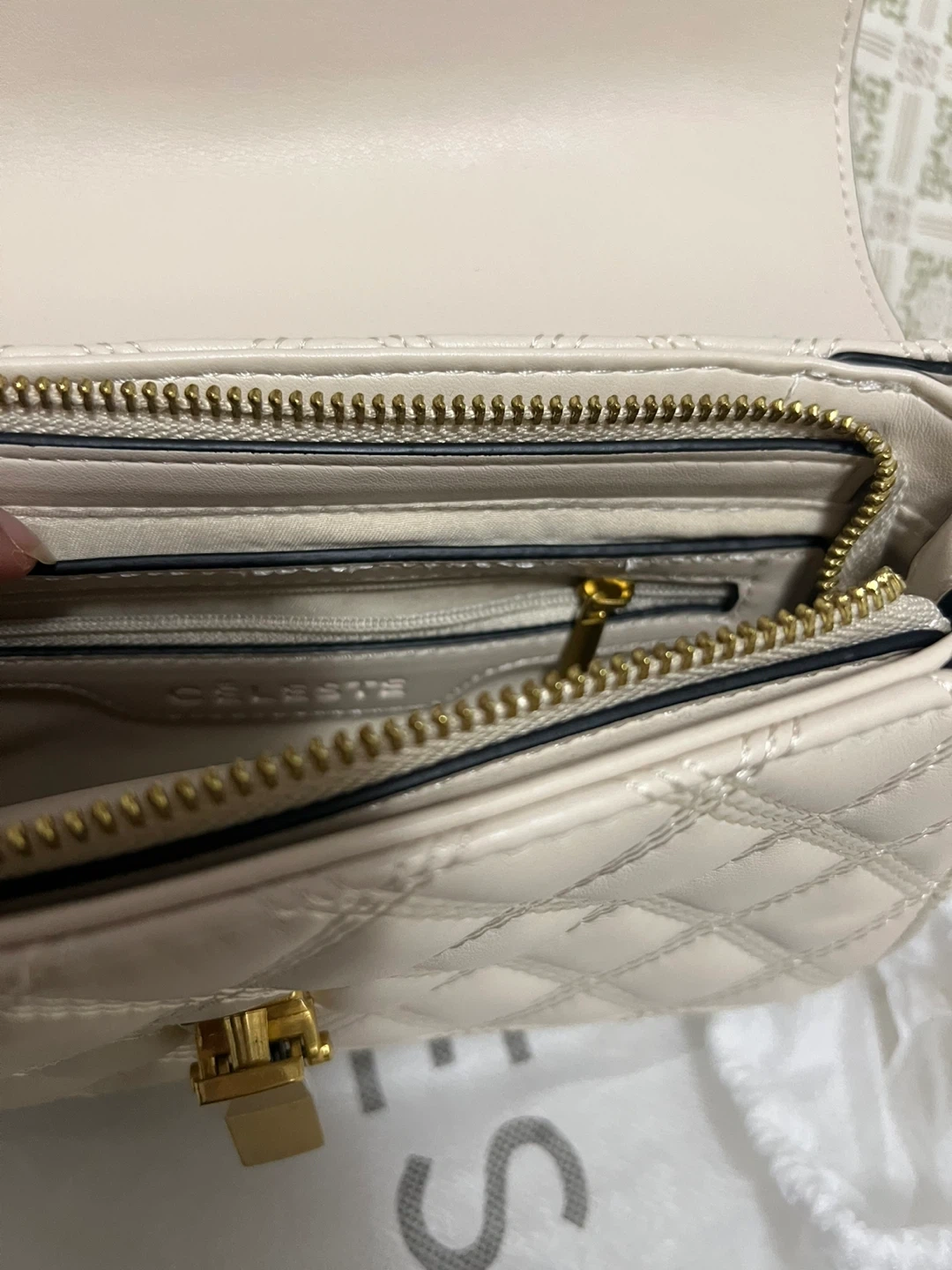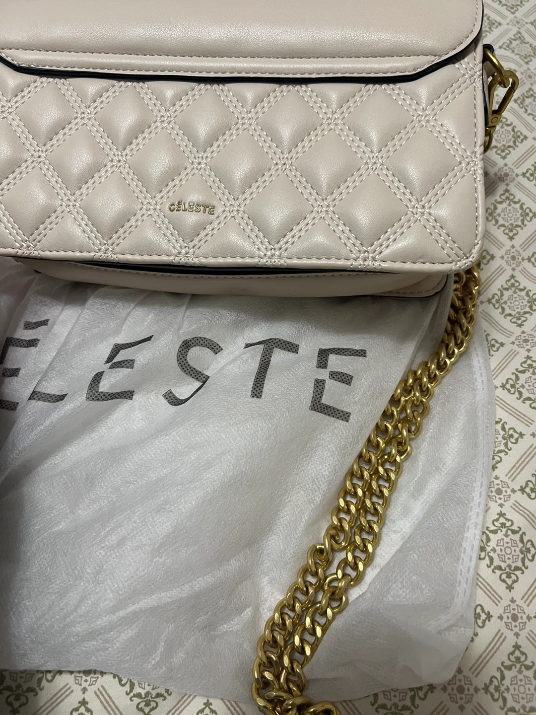 Stylish cream quilted handbag from Celeste. It features a secure gold clasp closure and a detachable gold chain strap. Includes a dust bag for storage.