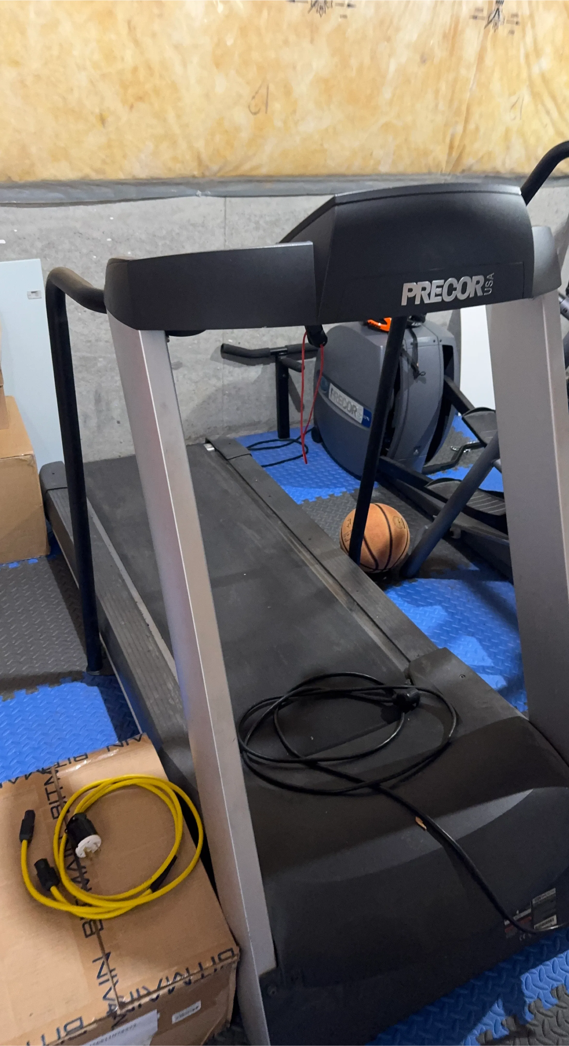 This is a Precor 9.33 treadmill. It has a large display panel showing time, distance, incline, speed, METs, and calories/minute. Quickstart function available.