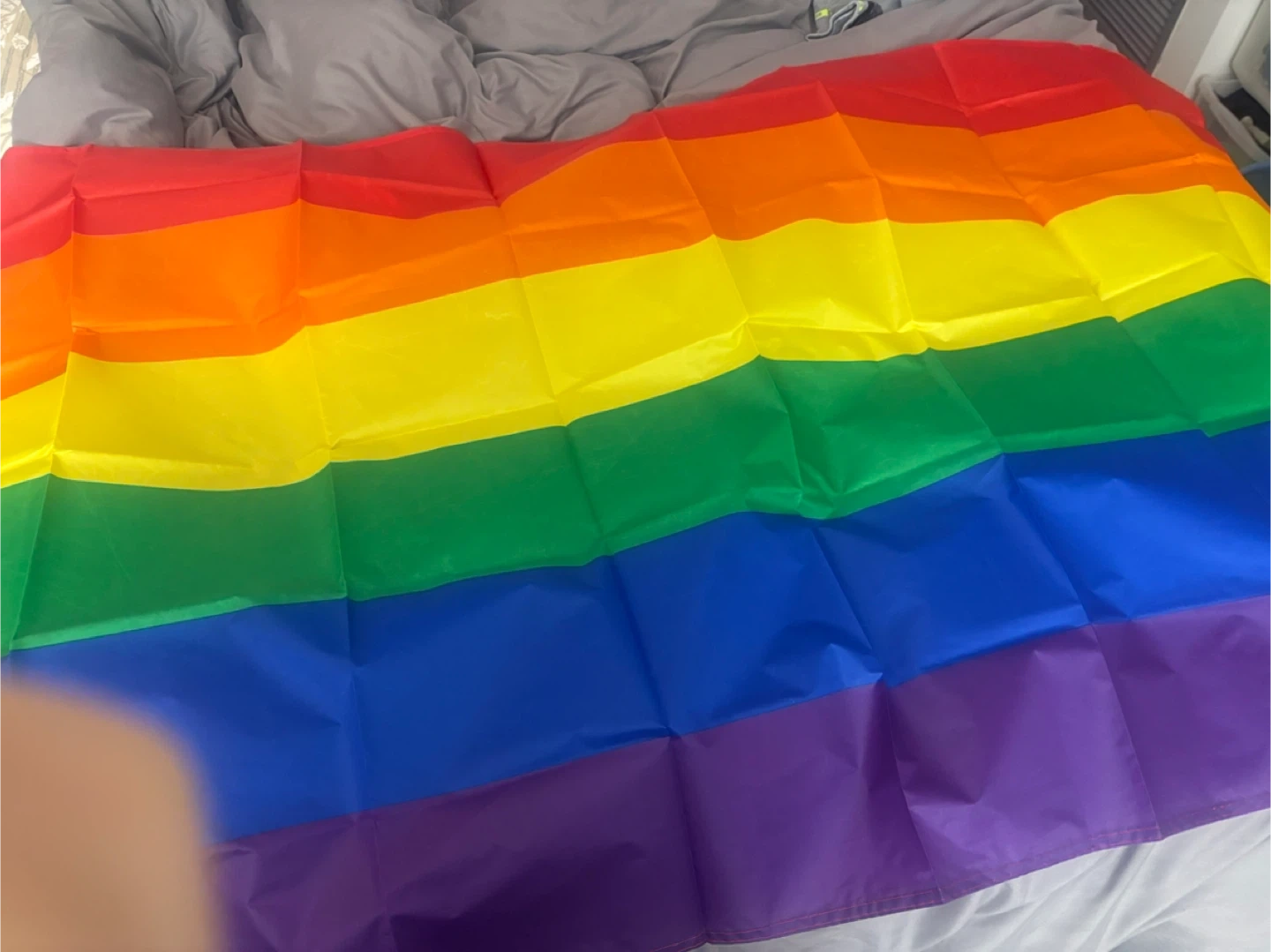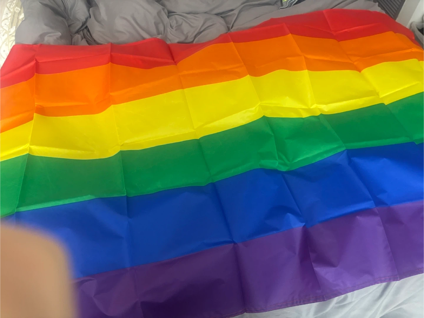 This is a rainbow pride flag. It's made of fabric and displays the six classic colours of the pride flag: red, orange, yellow, green, blue, and purple. It's perfect for displaying during Pride Month or any time you want to show your support.
