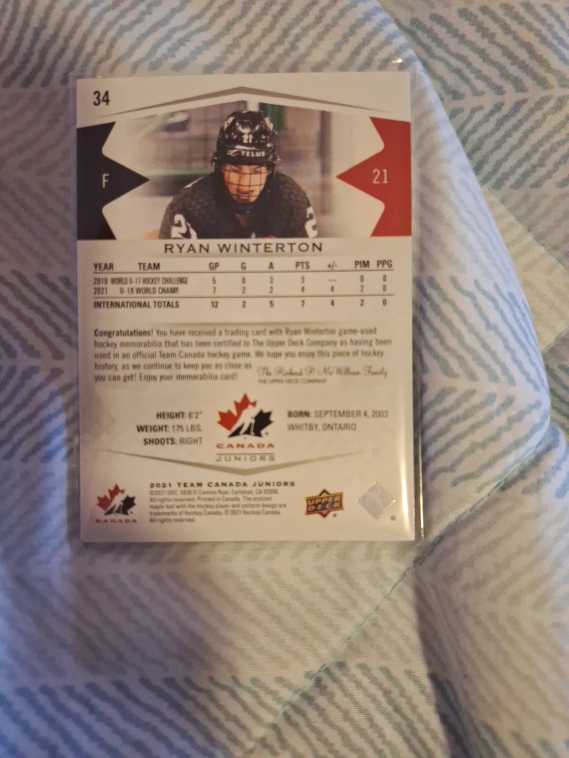This is a 2021 Upper Deck Ryan Winterton game-used hockey memorabilia card. It's officially certified by Upper Deck as having been used in an official Team Canada hockey game. The card features a piece of jersey used by the player.