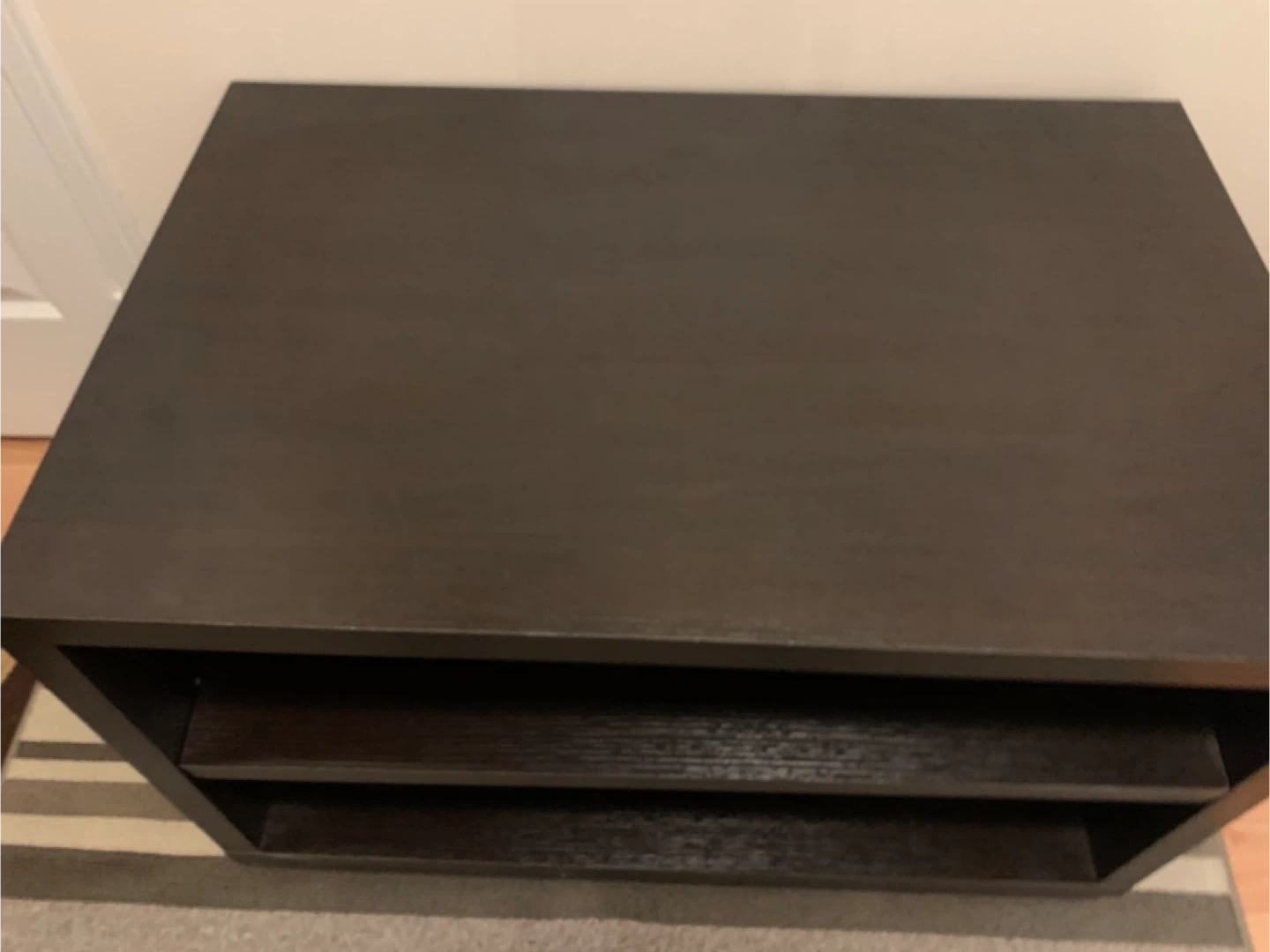 This dark brown media console has two open shelves, perfect for storing electronics or displaying decor. It's a sturdy unit suitable for any living room. Its simple design fits most decors.