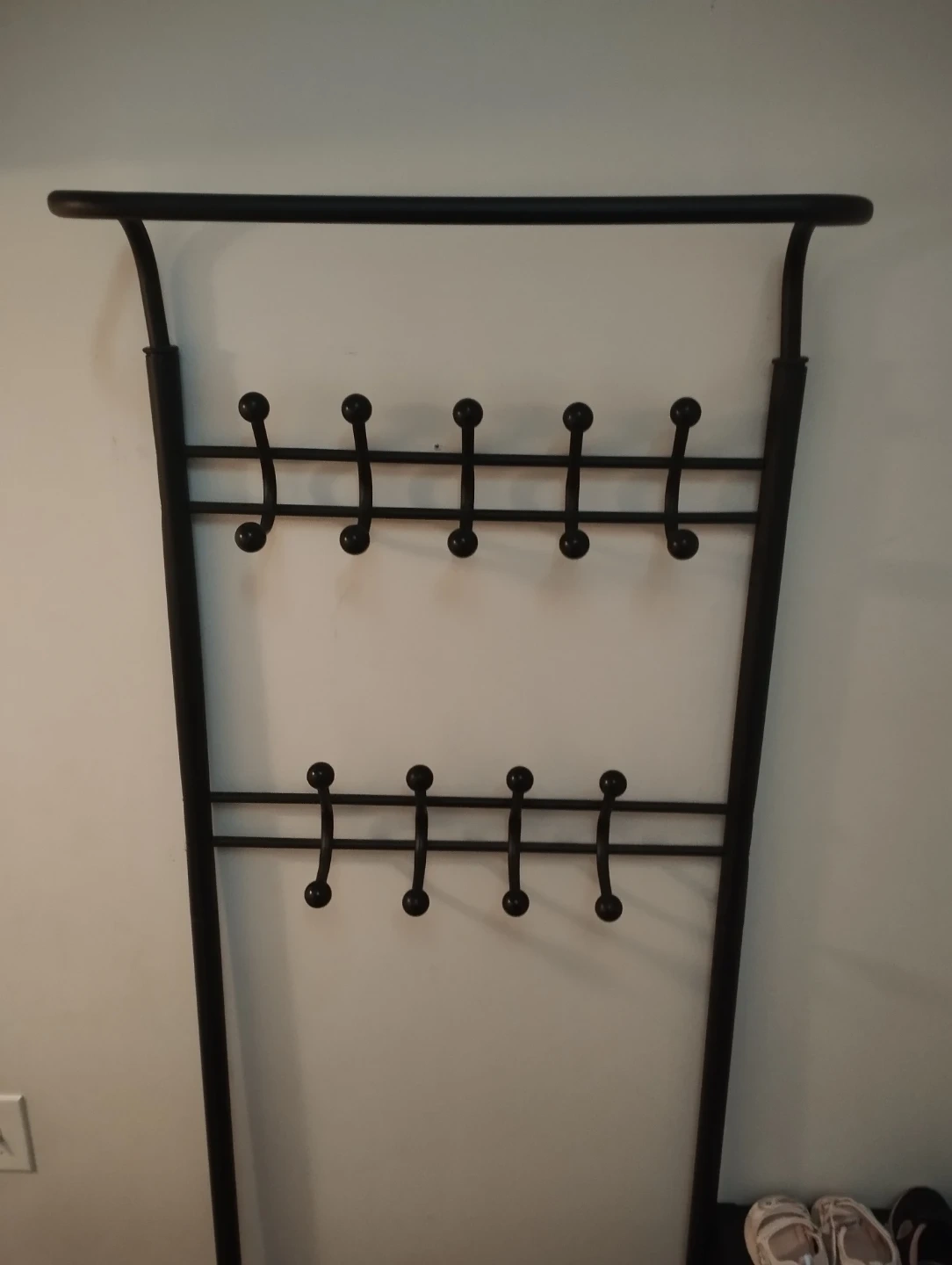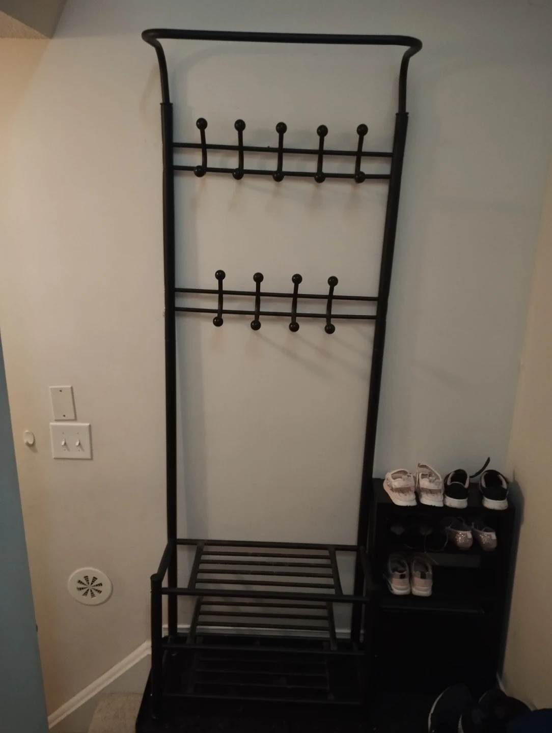 metal entryway rack with multiple hooks for coats/bags and a shoe storage shelf at the bottom. Perfect for organizing your hallway, mudroom, or closet.