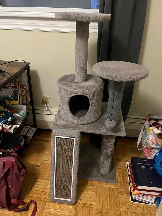 Large grey padded cat tree with house and 3 scratchers, and toy. Great condition, has been taken apart for transport and fits in one large box.