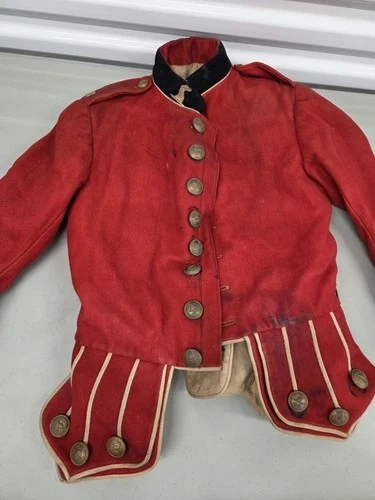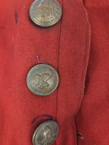 Authentic Victorian-era Scottish Highland military tunic, dating to approximately 1860–1875, associated with Scottish Highland Volunteer or Militia units. This is an original 19th-century garment, not a reproduction. It features scarlet red wool construction with a heavy period canvas/linen lining, a short coatee-style cut with split skirt tails, black cuffs with original brass buttons, and decorative skirt panels with original piping. The original brass buttons are stamped “HIGHLANDERS” with a thistle emblem. There's a handwritten period marking inside, likely an original issue or tailor notation. Buttons marked simply “Highlanders” were commonly used by Scottish Volunteer and Militia Highland units. This uniform was worn during the Victorian Volunteer Movement. It is in good antique condition consistent with age and service, with honest wear, fading, and staining present. No modern repairs are observed, and all buttons appear original. The fabric remains structurally sound for display. Please review all photos carefully, as they form part of the description. This listing is for the tunic only; no trousers, belt, or accessories are included. Ideal for collectors, museums, reenactors, or historical display.