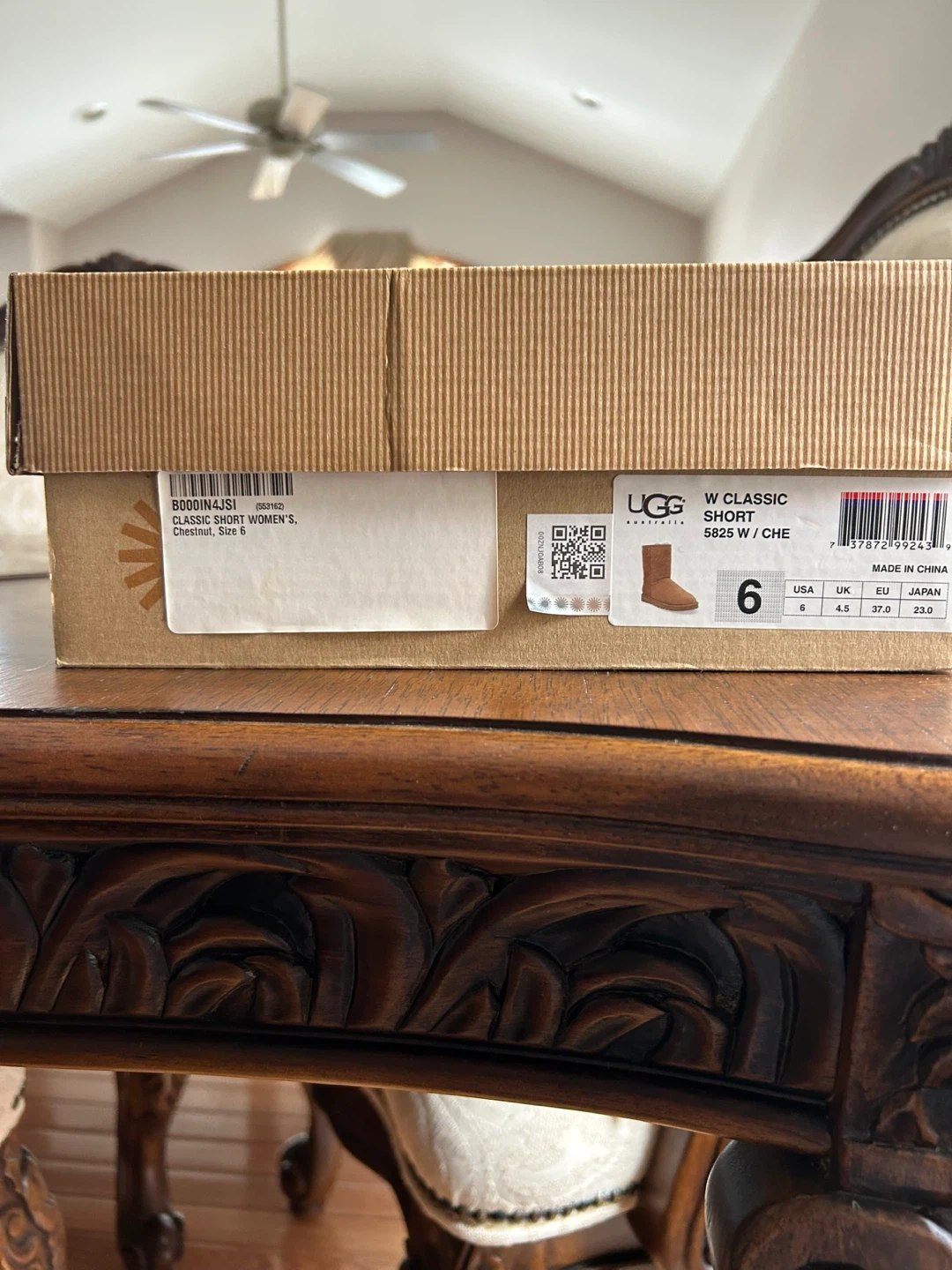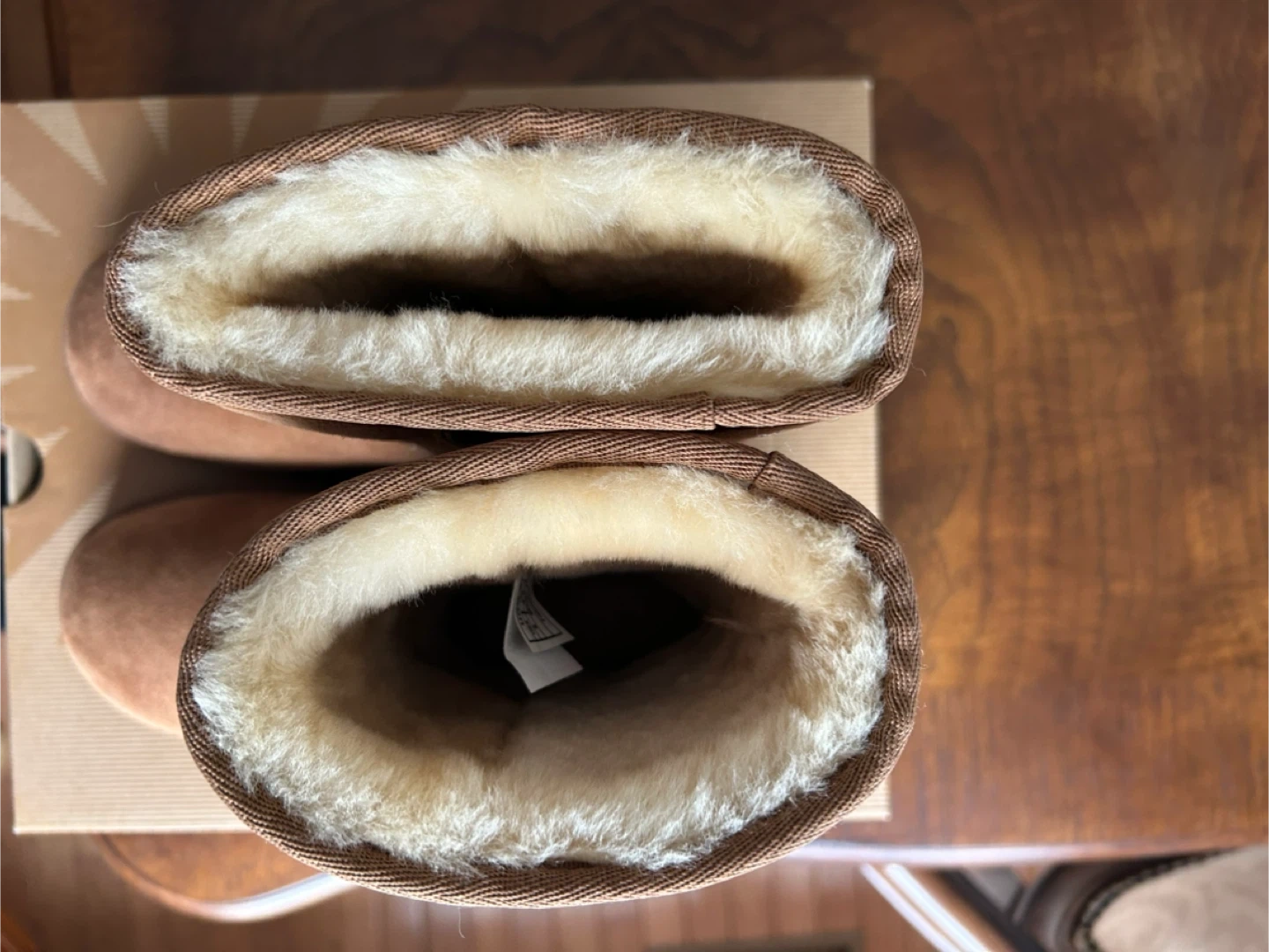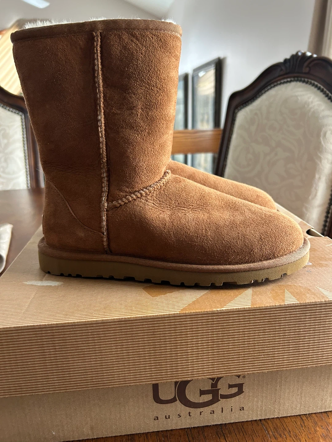UGG Australia Classic Tall boots are made of chestnut suede with a cozy sheepskin lining, size 6. They're perfect for keeping your feet warm on chilly days. The boots come with their original box.
