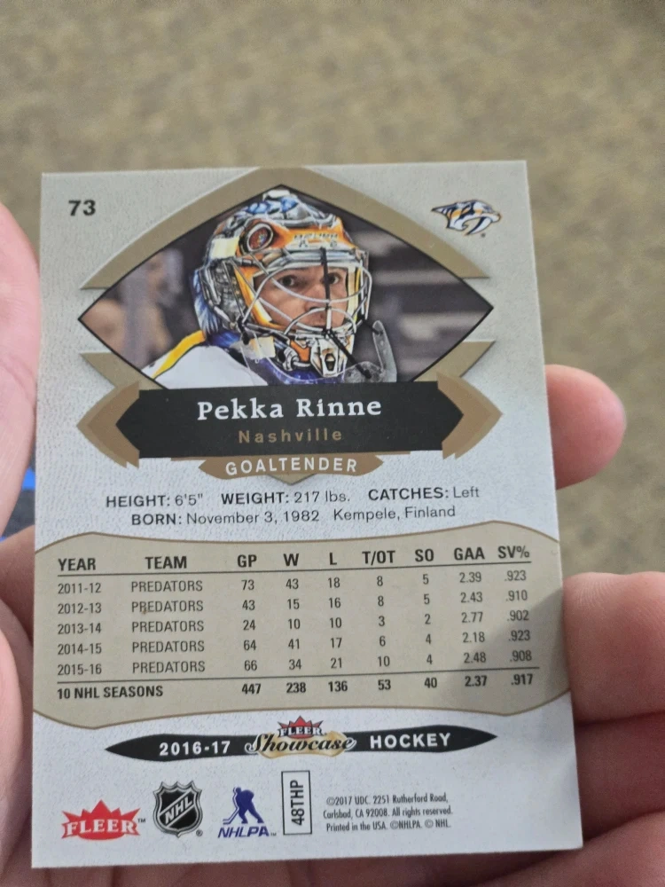This is a 2016-17 Fleer Showcase hockey card featuring Pekka Rinne. It details his career statistics as a goaltender for the Nashville Predators. The card includes his height, weight, and birth date.