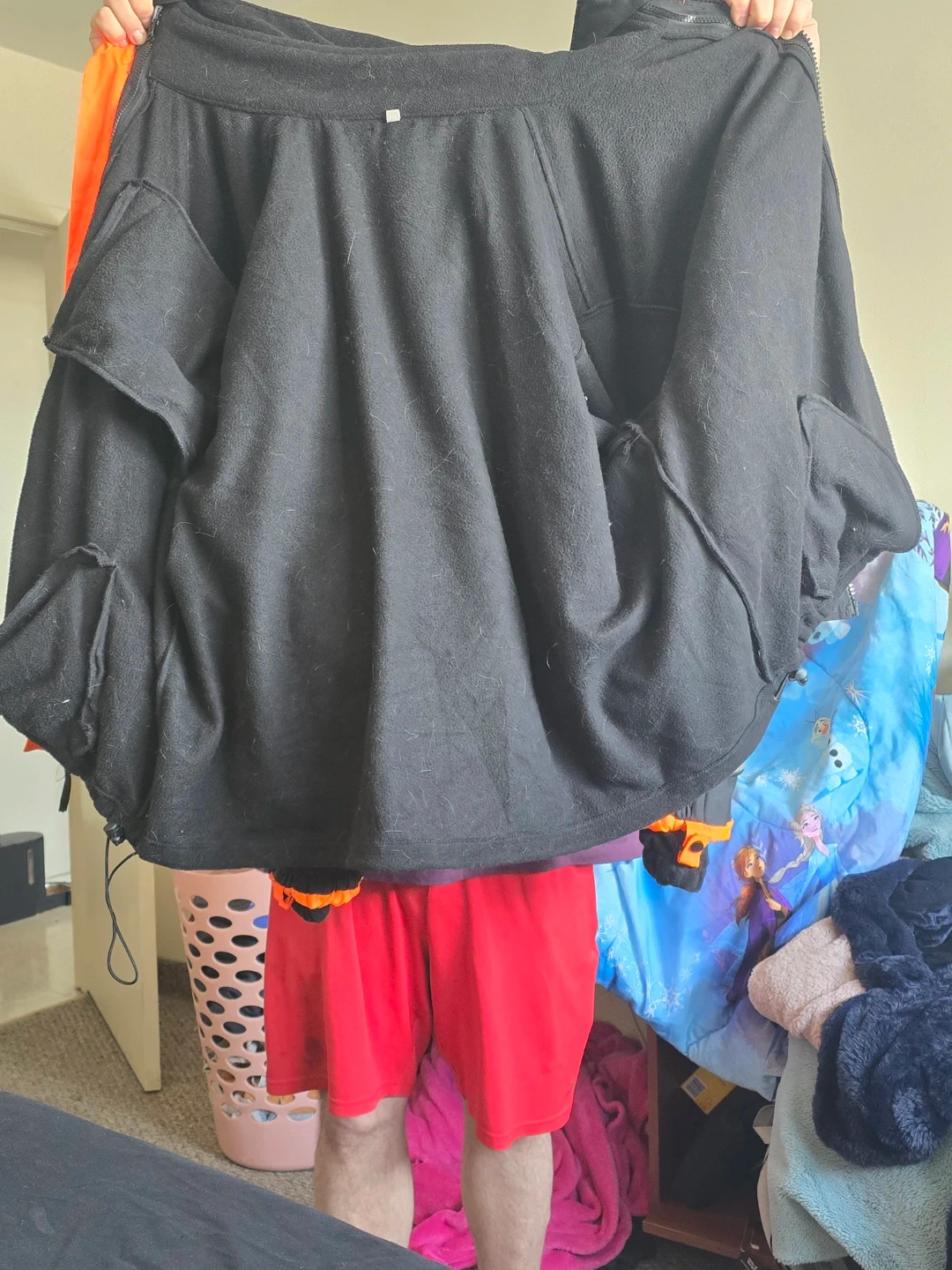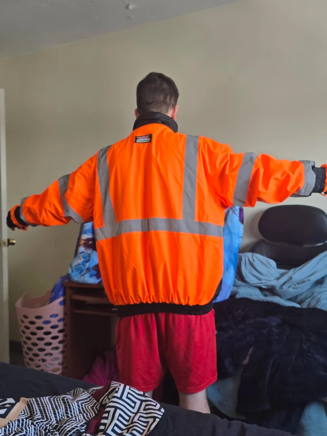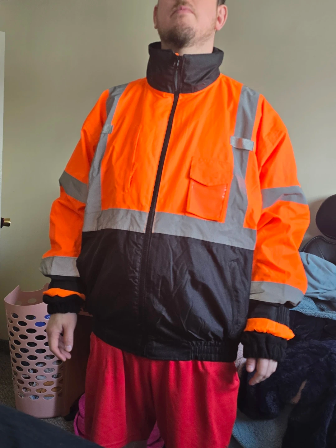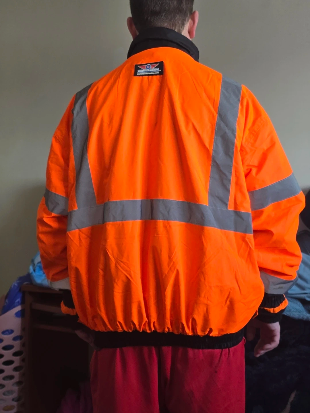 This is a high-visibility orange work jacket. It features reflective strips for increased visibility. The interior is lined with black material for warmth. Interior lining is removable to wear in warmer weather as spring or fall jacket. 2 jackets for the price of one