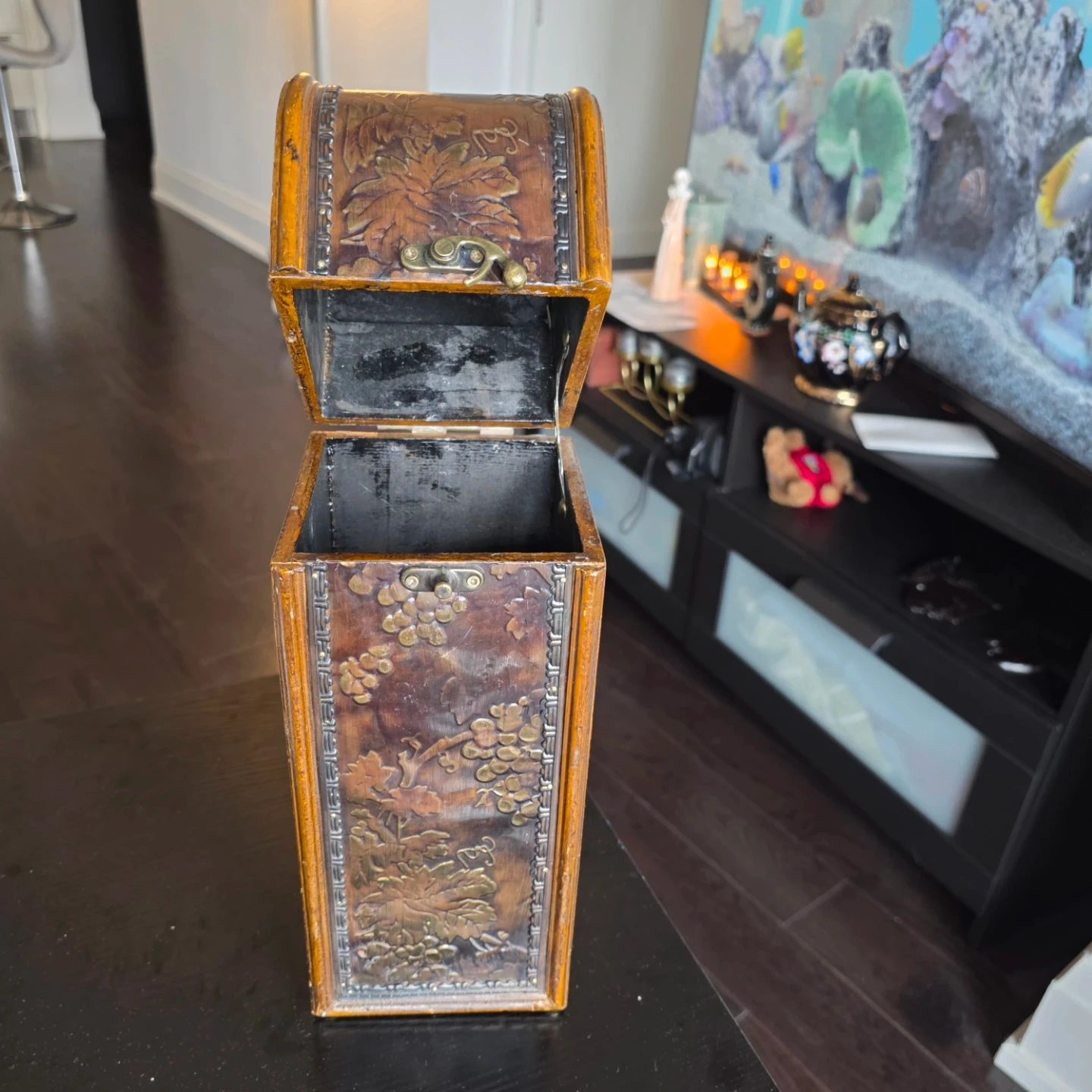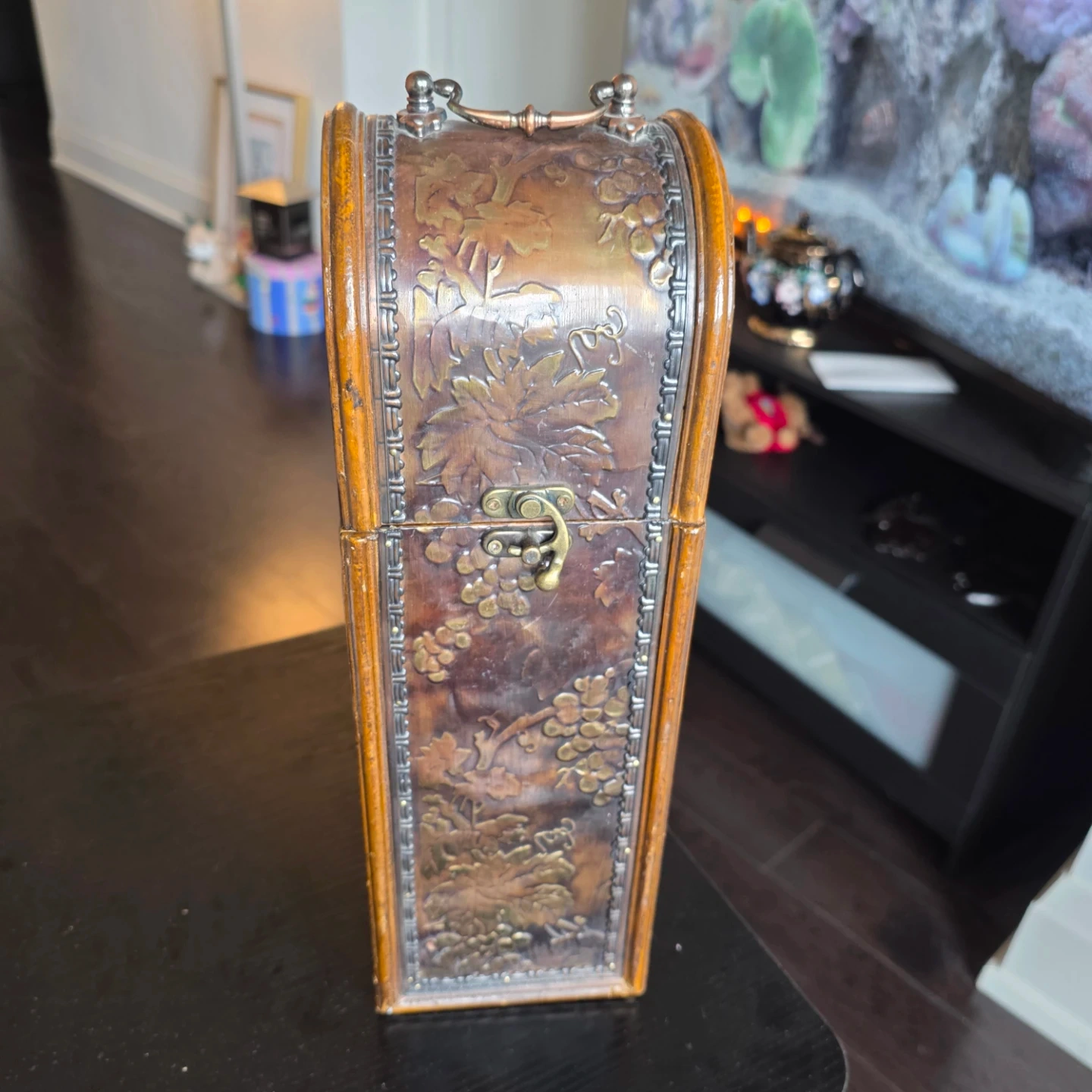 A lovely wooden holder designed for a single wine bottle. It features a decorative embossed grape vine design on all sides and a hinged lid with a latch closure. This holder's unique design makes it a charming display piece for your wine collection. It's perfect for gifting or adding a rustic touch to your home decor!