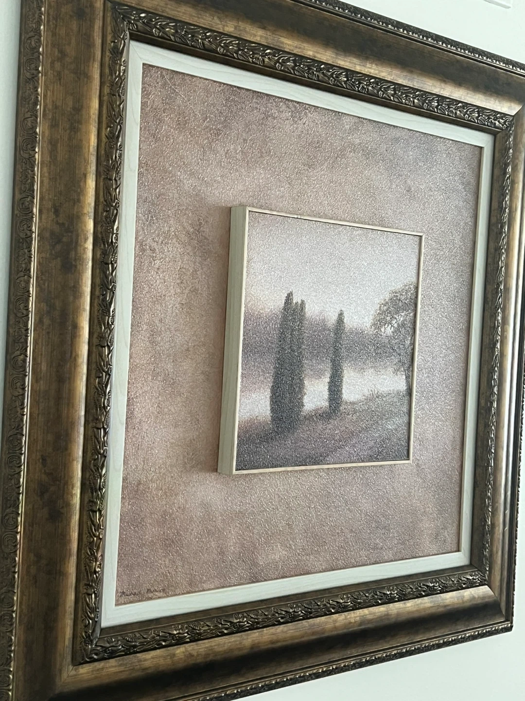 This framed artwork depicts a serene landscape with cypress trees. The detailed textured background and ornate frame add a touch of elegance to any room. It's a lovely piece for adding character to your living space.