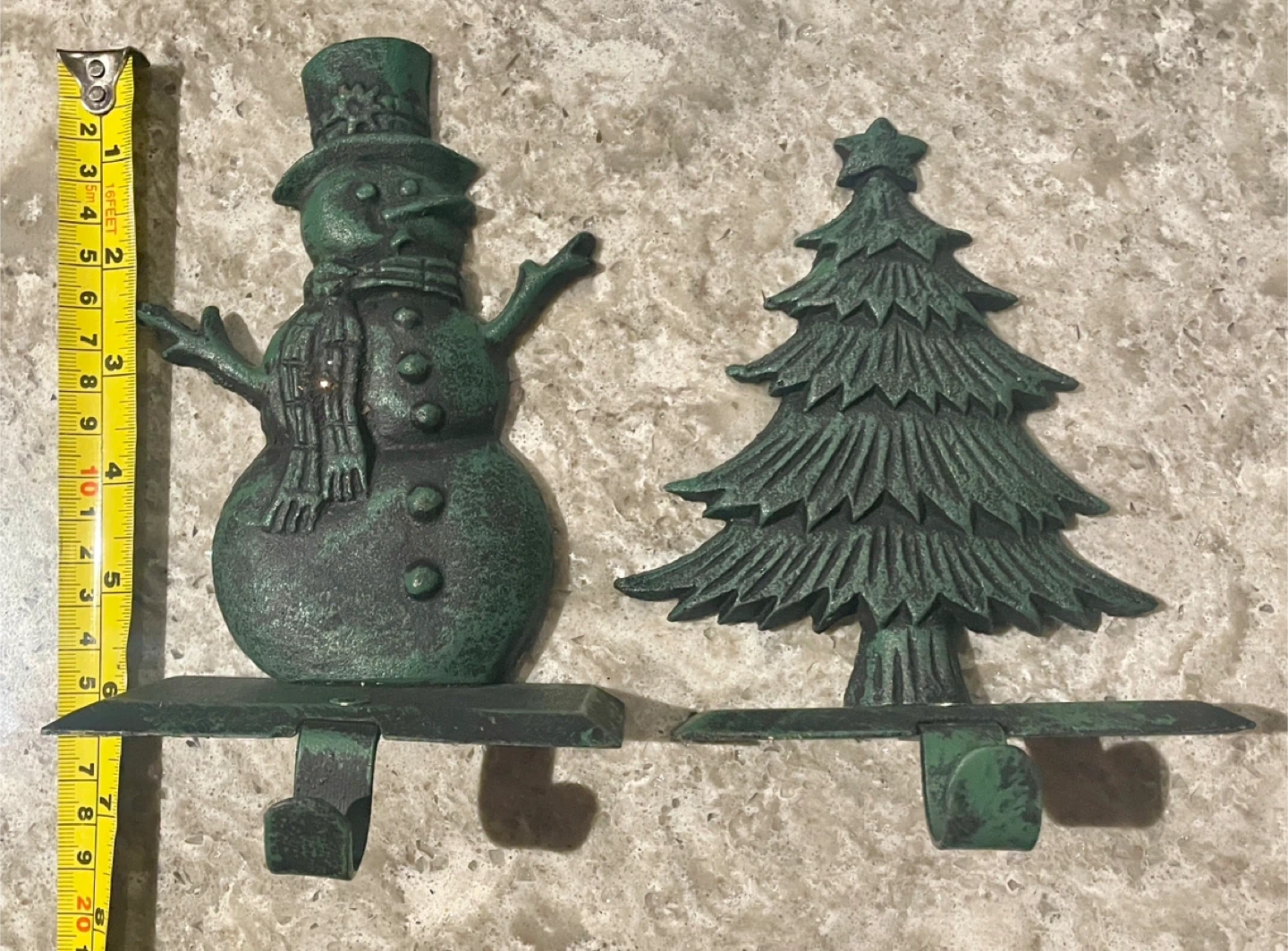 A collection of festive Christmas items, including several decorative stockings and assorted ornaments. This lot also includes two cast iron stocking holders shaped like a snowman and a Christmas tree. Perfect for adding a touch of holiday cheer to your home!