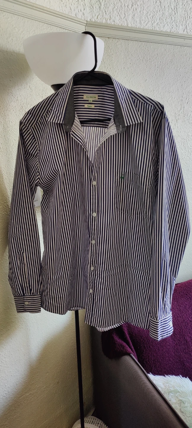 This is a United Colors of Benetton button-up shirt. It's a size 42. with a regular fit. The shirt features navy and white vertical stripes. I took my diet a lil too seriously and now this shirt won't fit me anymore.