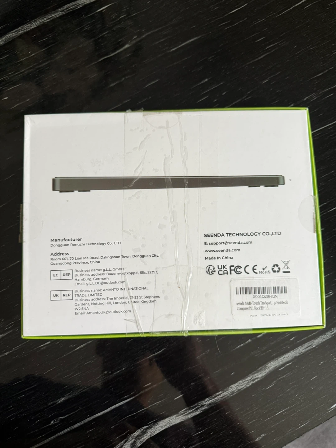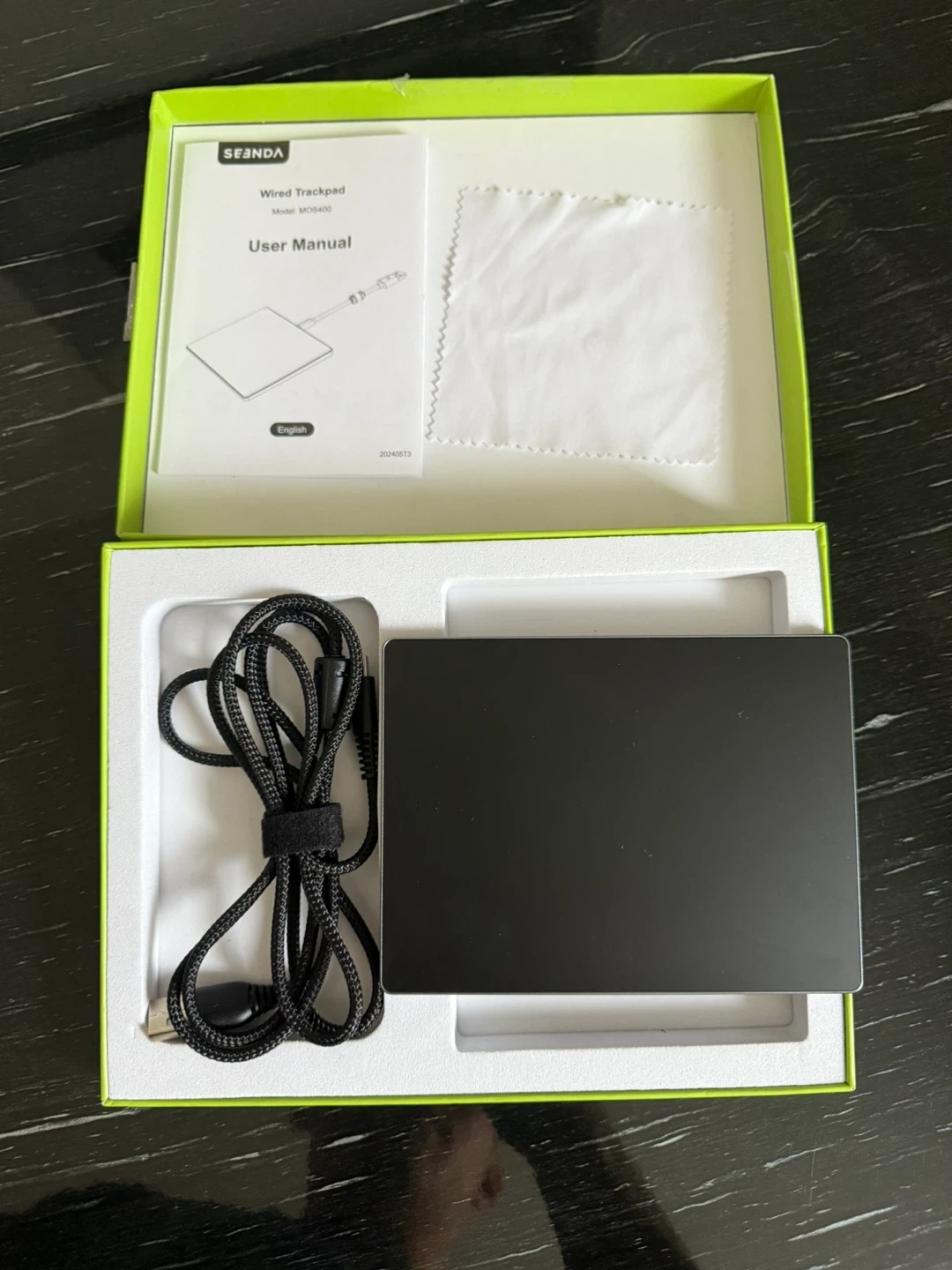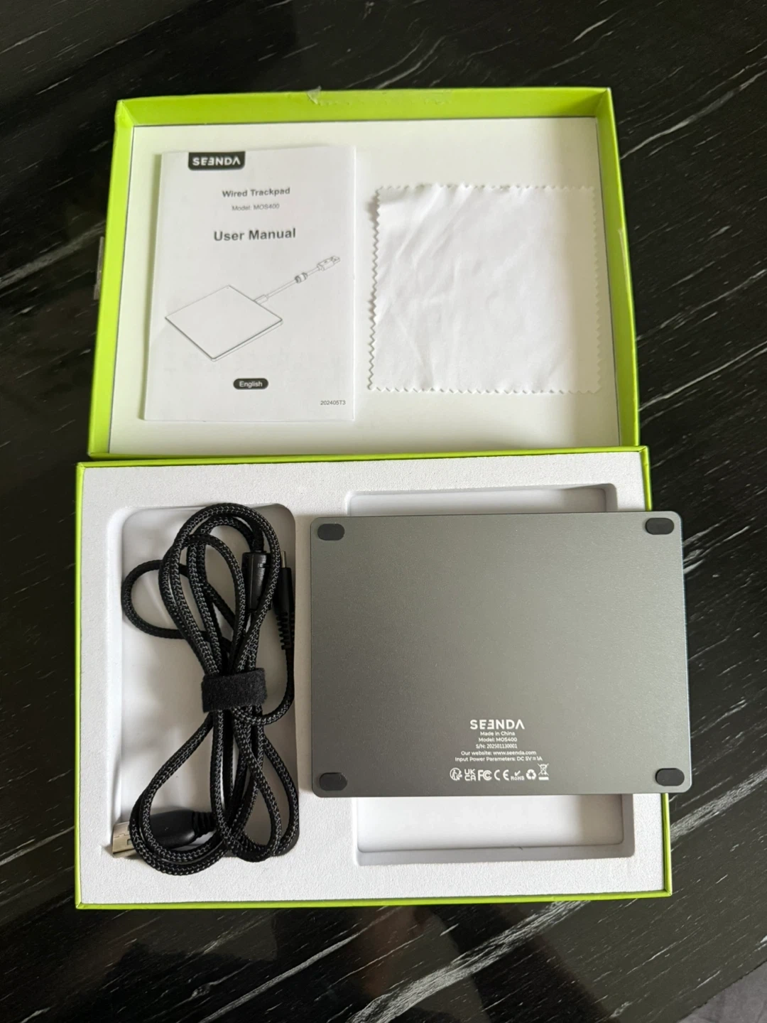 This SEENDA wired trackpad is model MOS400. It's made of aluminum and comes with a USB-C cable. A cleaning cloth is also included in the box.