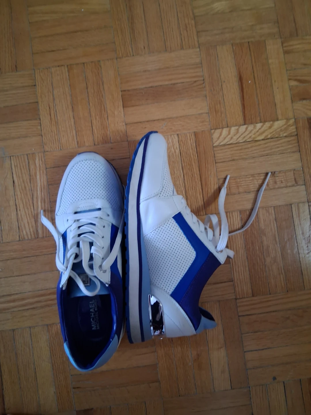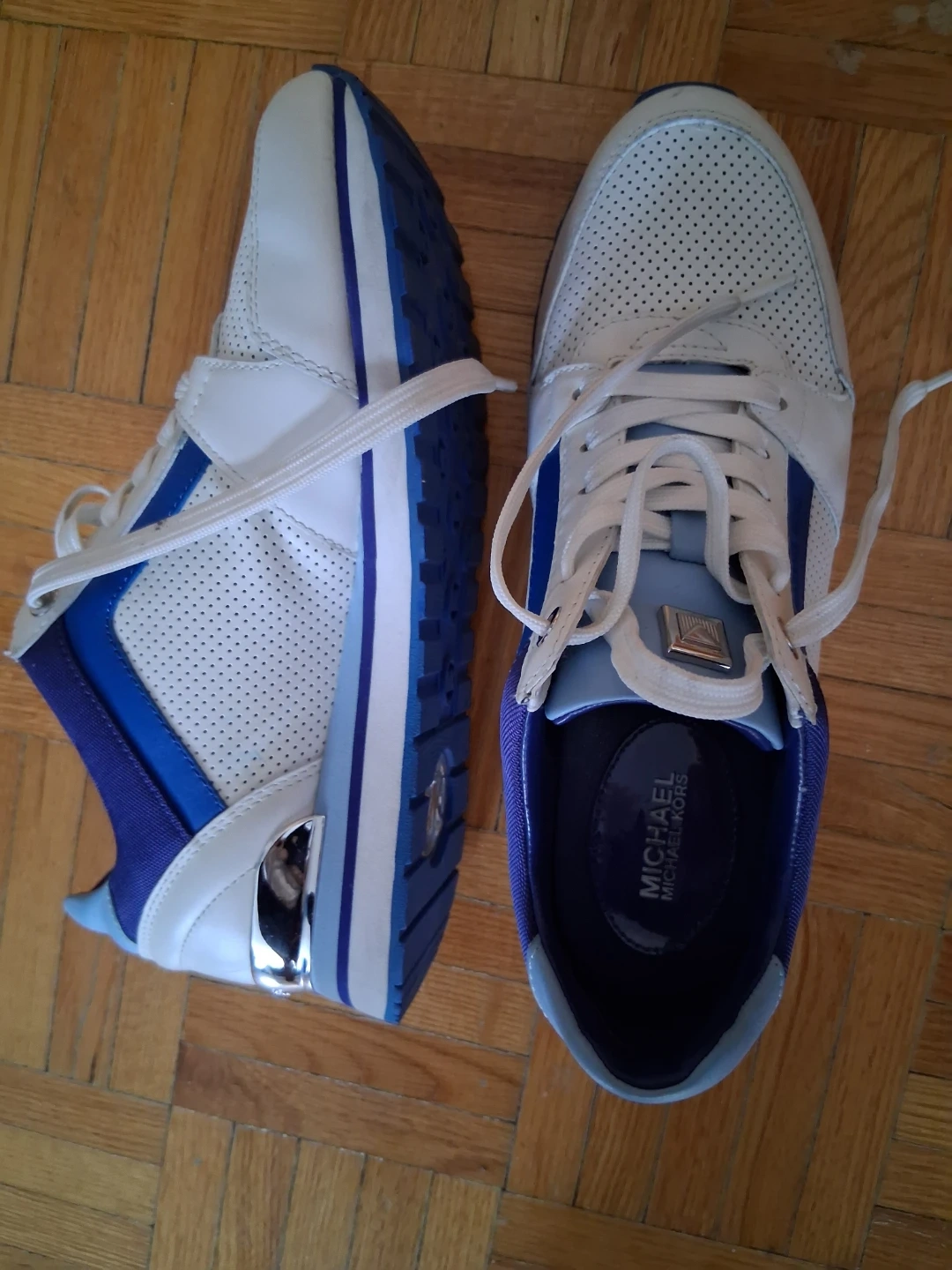 Michael Kors sneakers in white and blue leather. These kicks are super comfy and stylish! They feature perforated detailing and a sleek design.