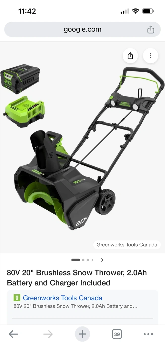This is a Greenworks 80V 20" brushless snow thrower. It comes with a 2.0Ah battery and charger. It's great for clearing snow from your driveway or walkways.