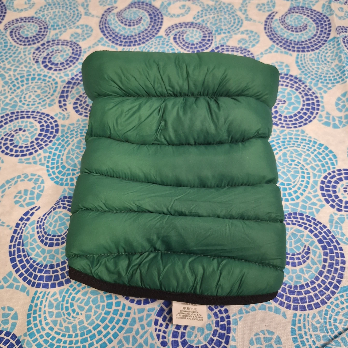 Quilted green puffer dog vest. Made of 100% polyester. Features snap closures and armholes for easy movement. Keep your furry friend cozy and stylish!
