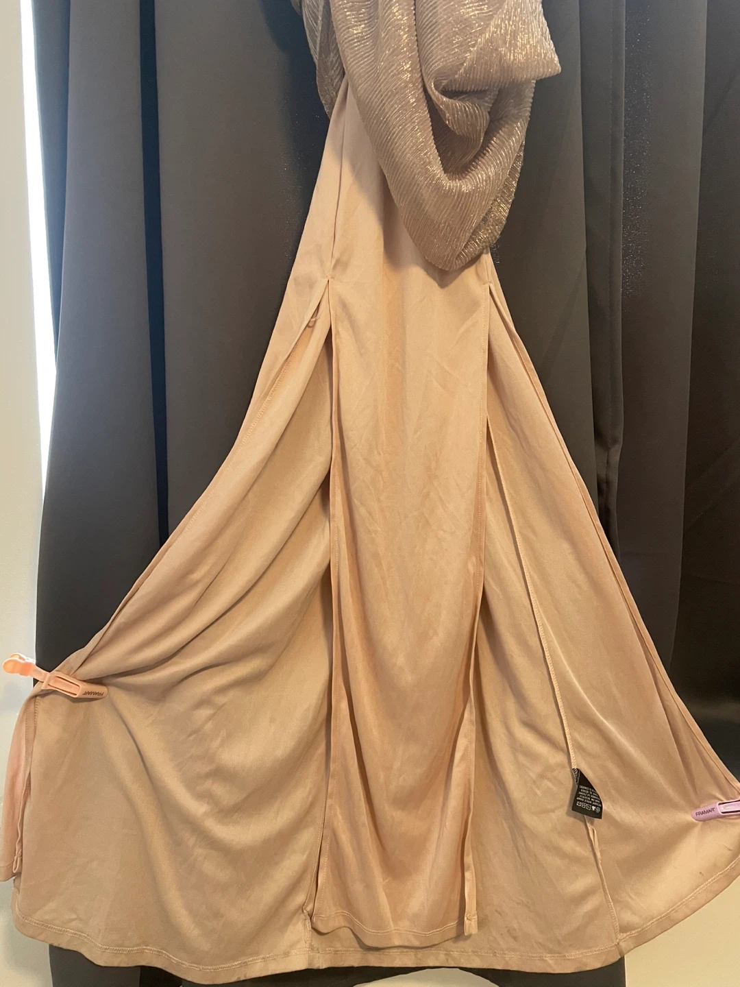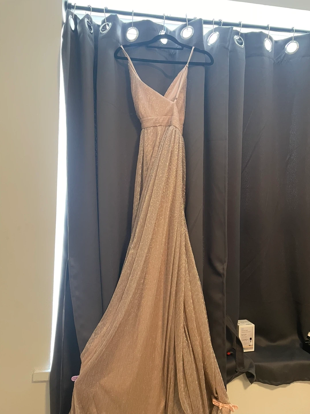 This sparkly rose gold evening gown features a flattering V-neck and a flowing skirt with a high slit. It's perfect for formal events and parties. Made with a shimmering fabric.