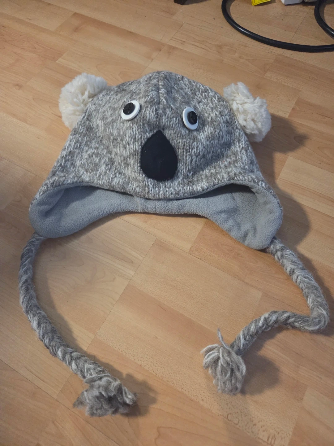 Warm knit hat designed to look like a koala face. It features cute pom-pom ears and braided ear flaps with tassels. The hat is lined with soft fleece for extra warmth. Made from a wool and nylon blend.