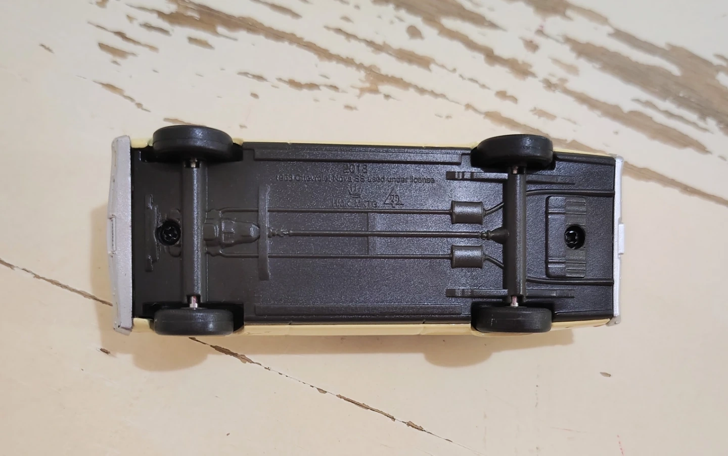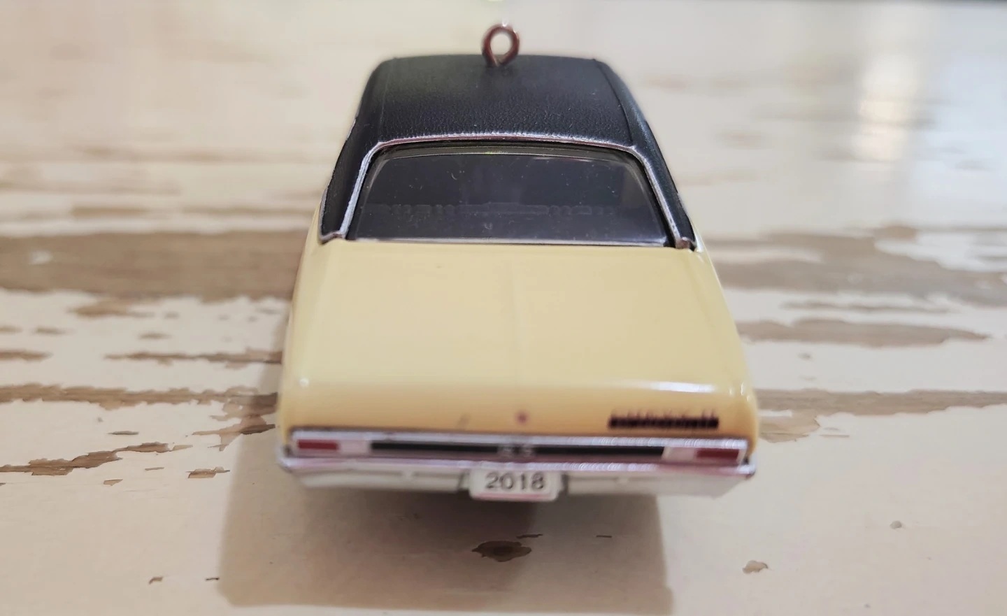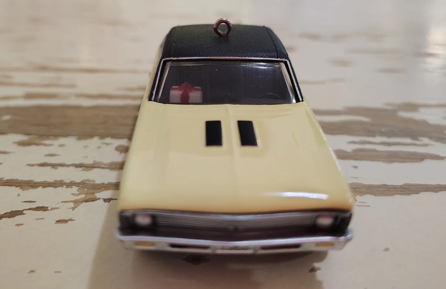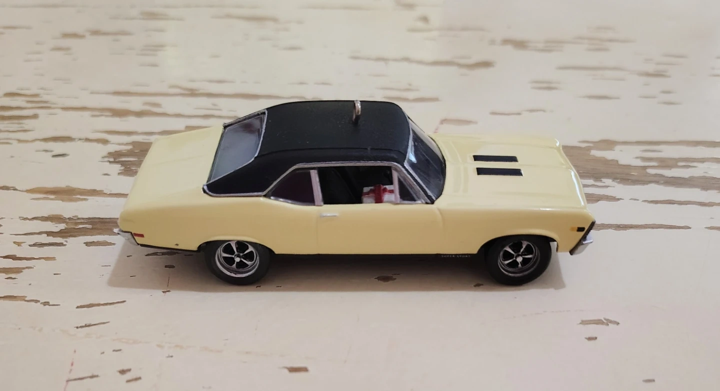 This is a 2018 Chevrolet Nova Super Sport 1968 collectible ornament. It's a die-cast metal model with a black roof and interior. Features a small gift detail inside the car.