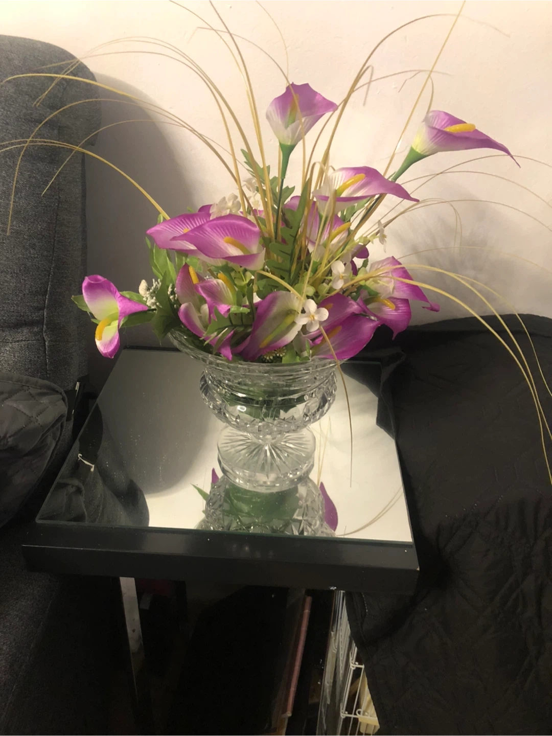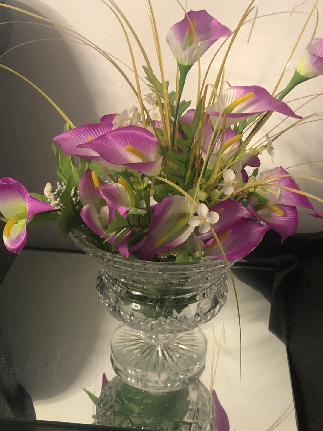 This artificial flower arrangement features purple calla lilies and other greenery in a clear glass vase. It's a lovely decorative piece for any room. The vase has a fluted design with a pedestal base.
