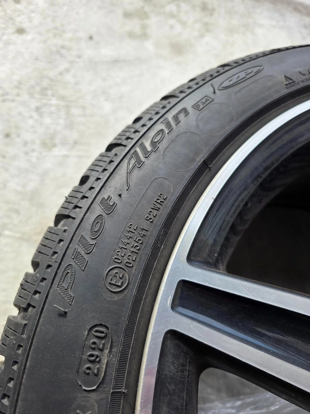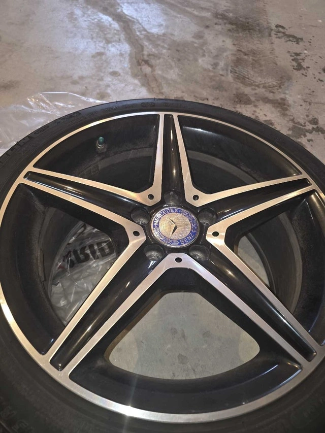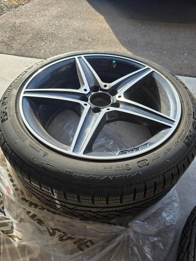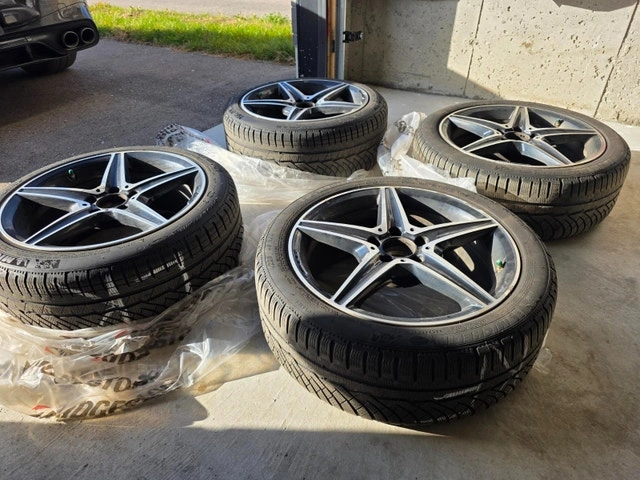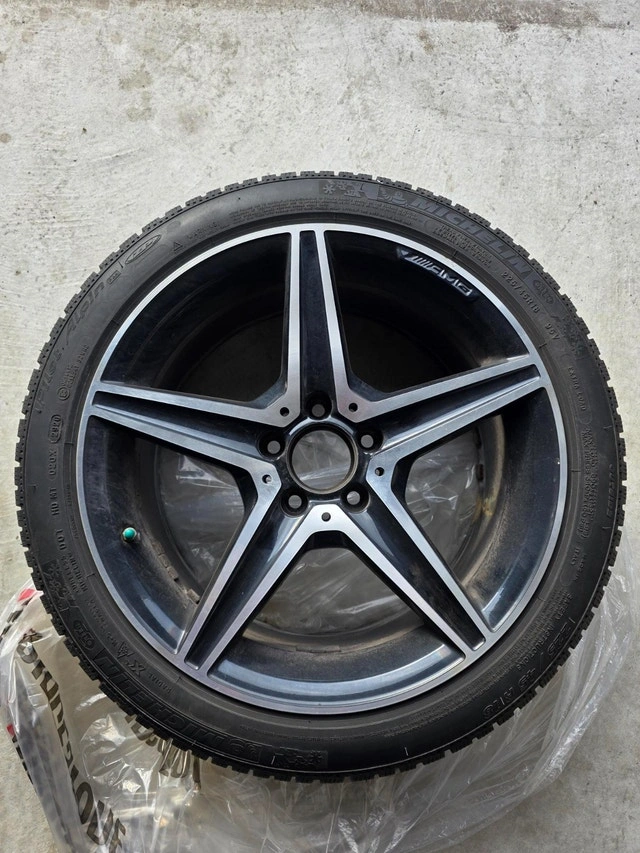 Selling a set of winter wheels that came off a 2021 Mercedes-Benz C43 AMG. They were used for two seasons (purchased Winter 2023) and are in good condition. One rim has minor curb rash, but otherwise, they are in great shape. These are OEM MB Rims and should fit most C-Class models (C300, C400, C450, C43), but please verify fitment for your specific vehicle. The wheels are staggered for the C43's front brakes and have been marked accordingly. Includes Tire Pressure Monitoring System (TPMS) and center caps.
