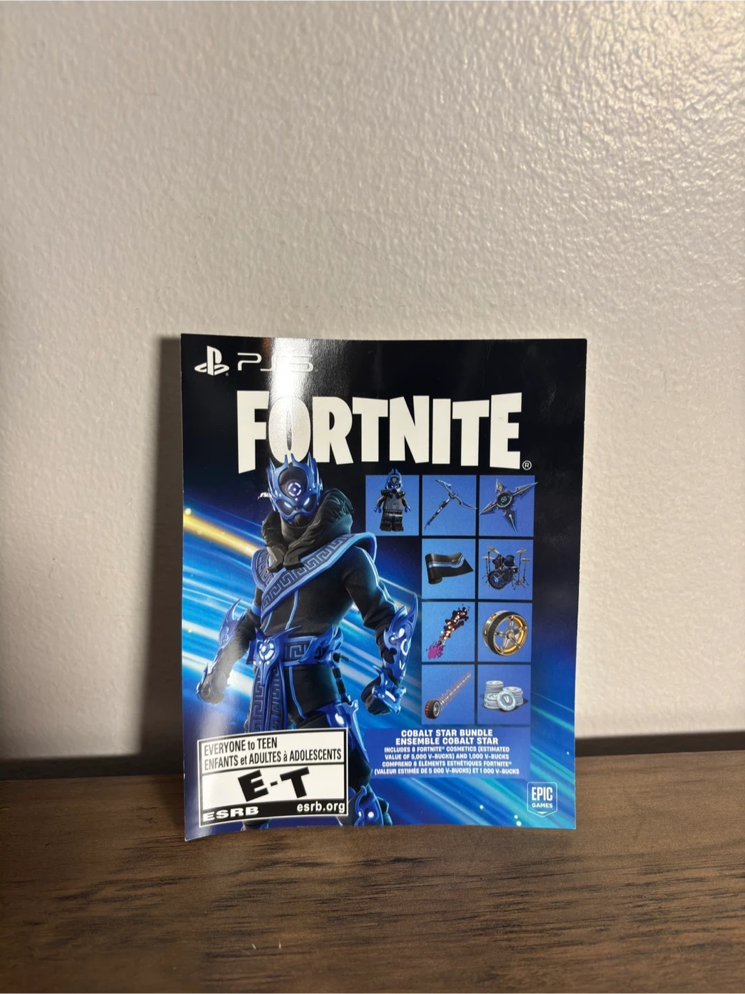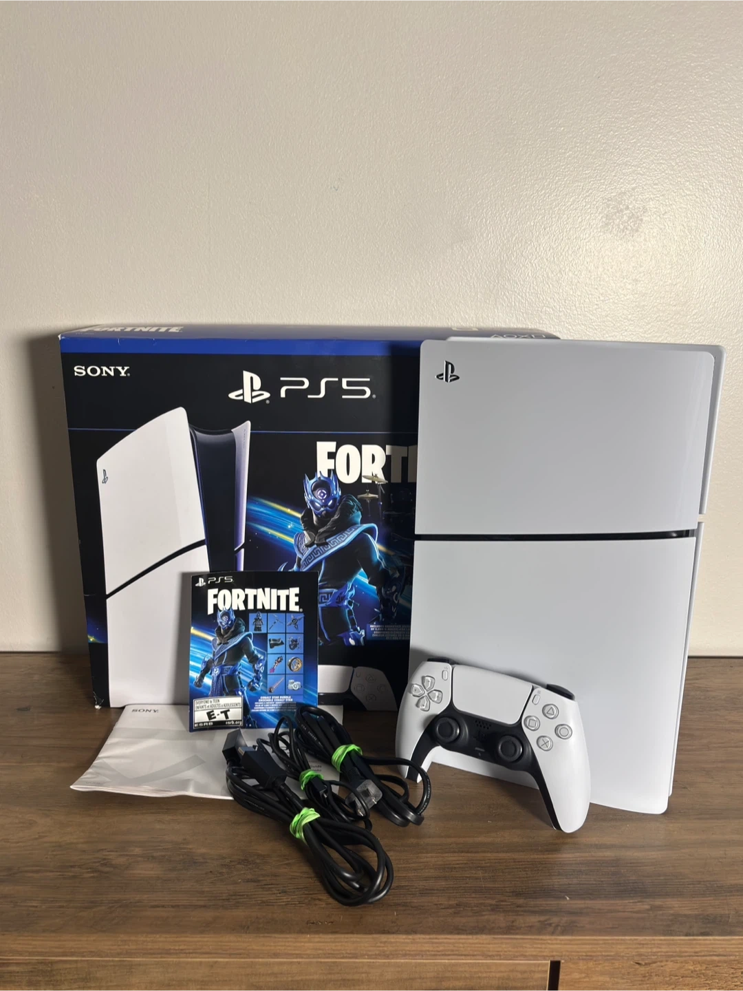 A PS5 Digital Slim 1TB in excellent condition — special Fortnite Cobalt Star Edition, complete with every original item.
