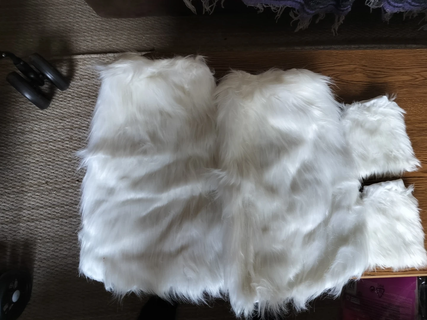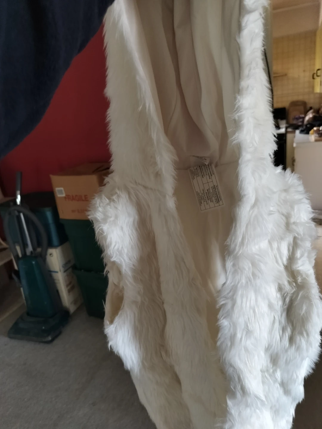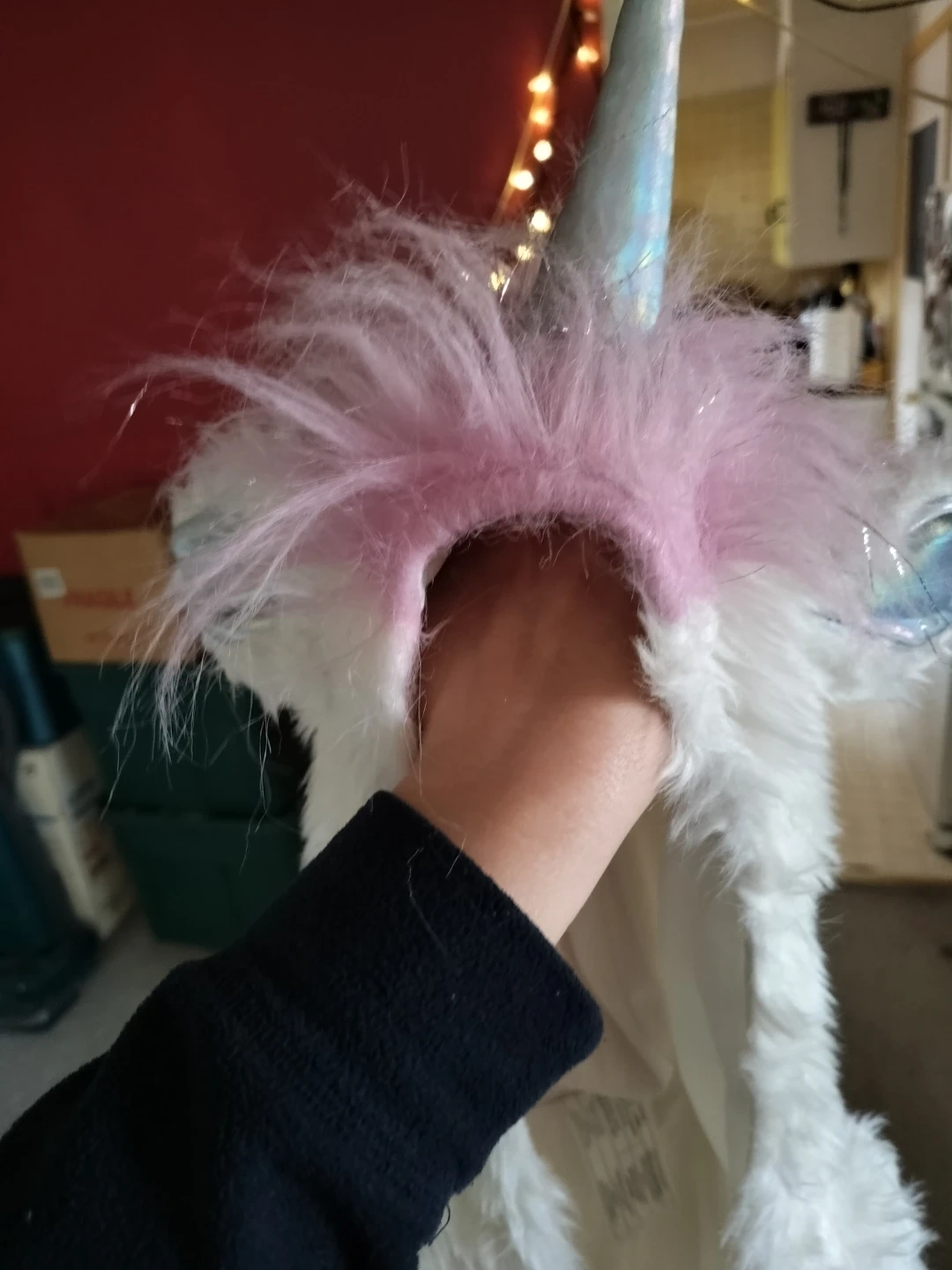 This fun hooded vest is white and furry, with a pastel pink mane and iridescent horn. It's perfect for dress-up or a costume party. The vest is soft and plush to the touch, has pockets, & is in great condition!! Includes clip on tail, leg covers, paw covers & sparkly wand. Adult size med.