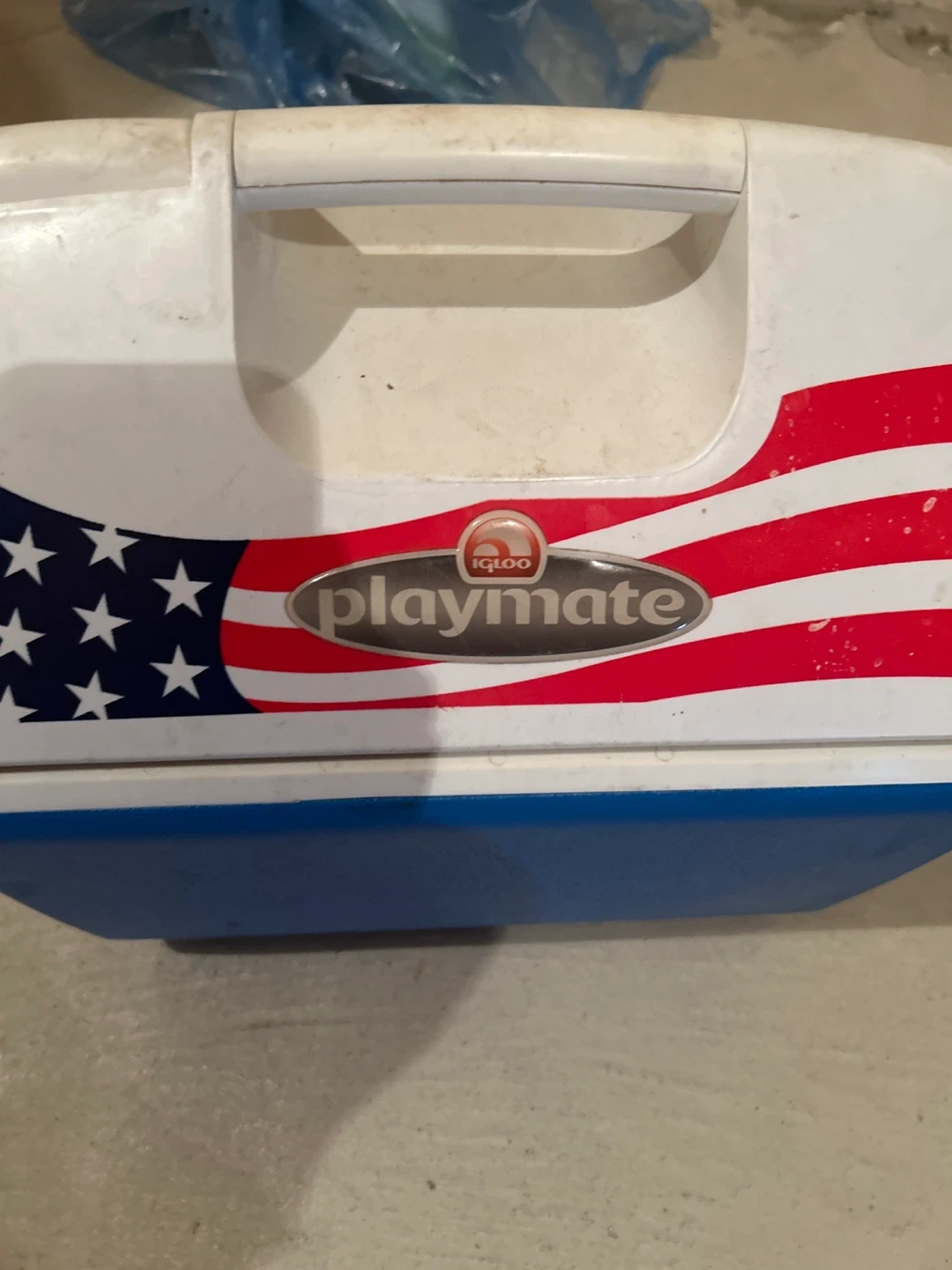 This is an Igloo Playmate cooler with an American flag design. It's in used condition. Perfect for picnics or outdoor events! It was bought in Japan