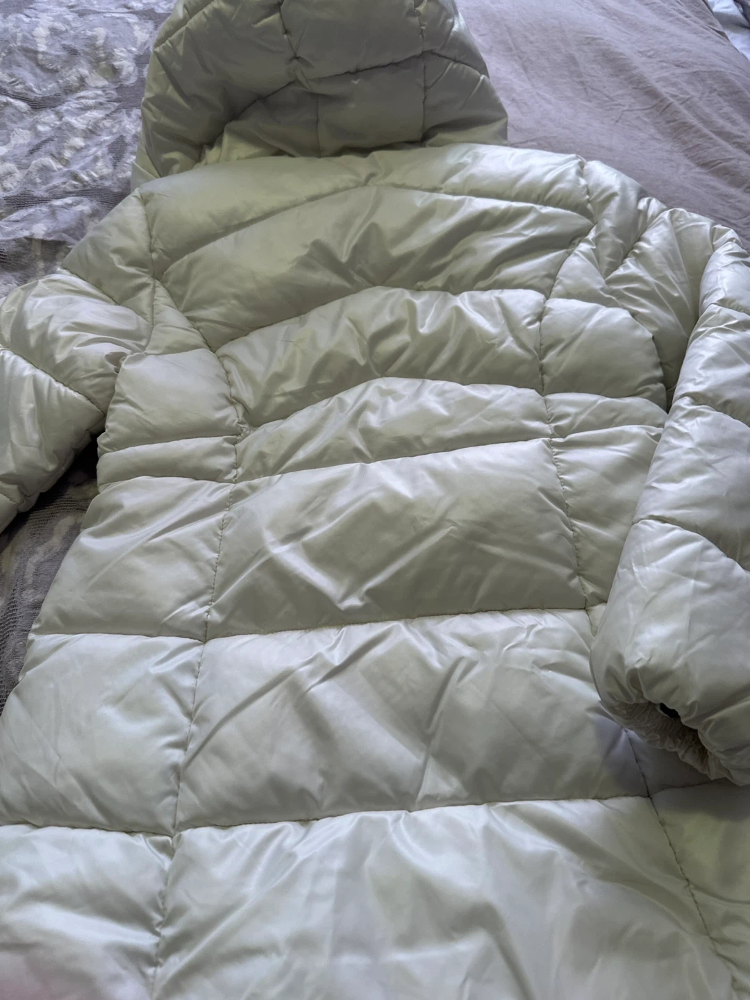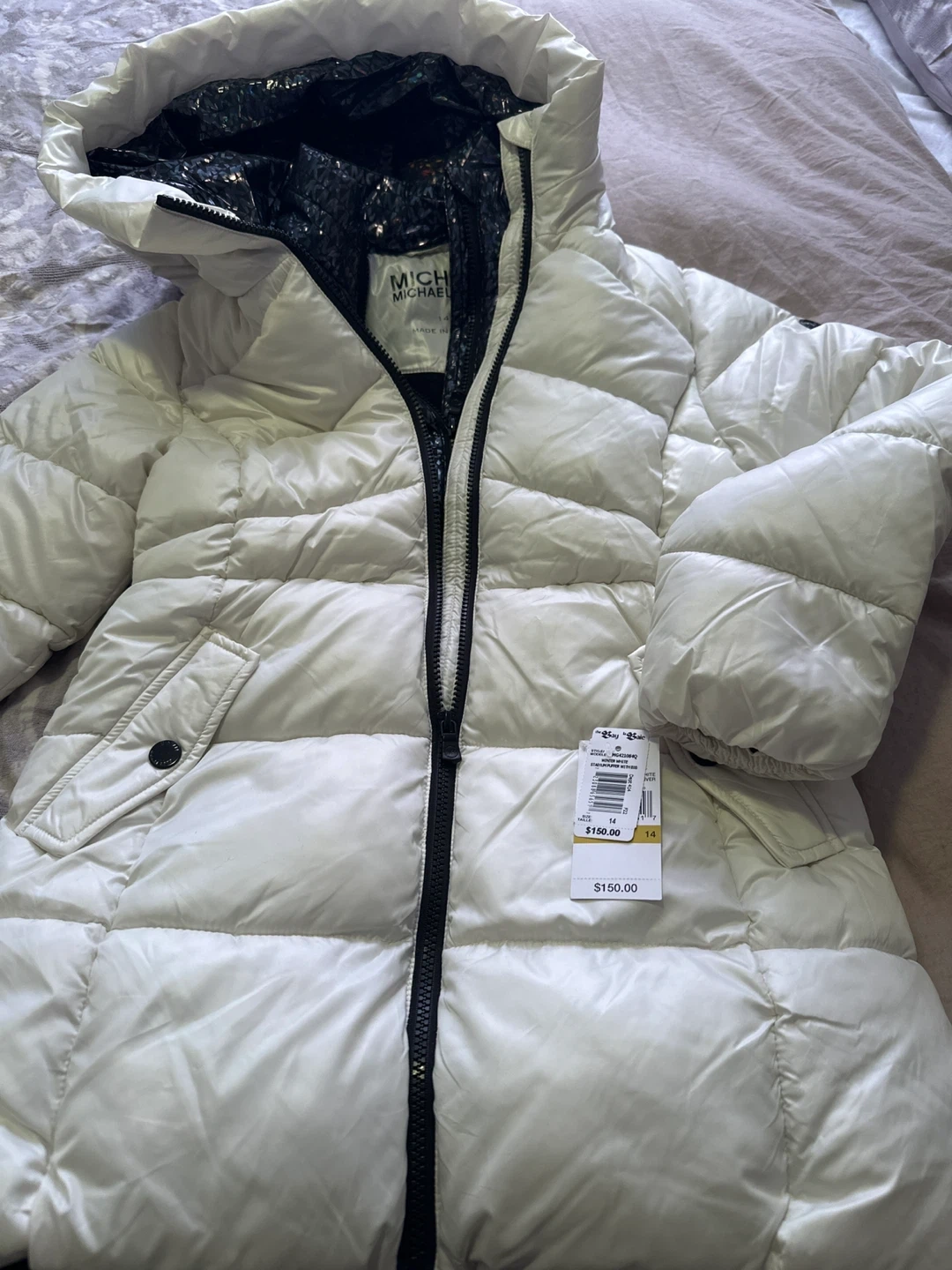This is a Michael Kors Winter Stadium Puffer Jacket. It's white with a shiny, patterned lining inside the hood. Size is for 14 years old girl