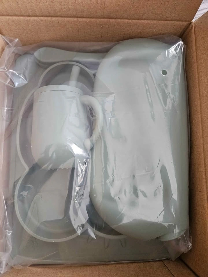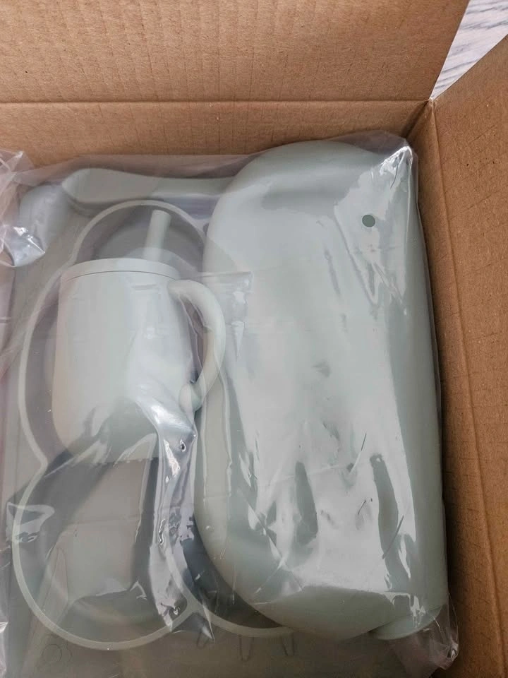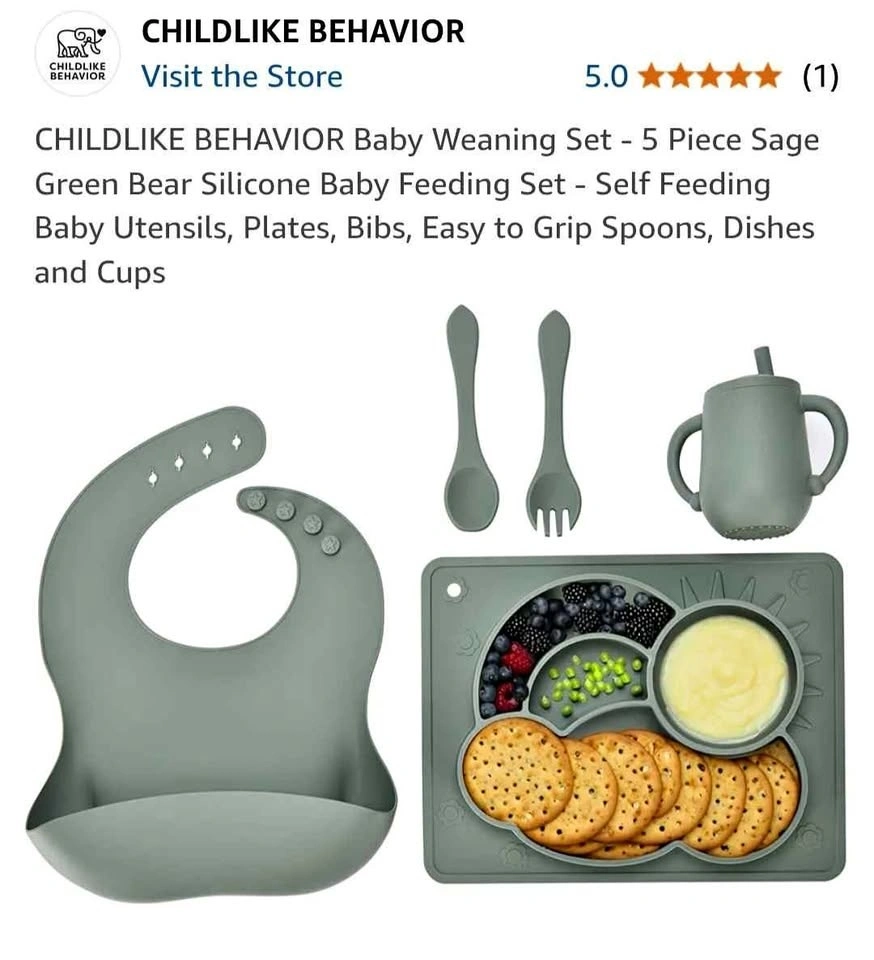 Brand new CHILDLIKE BEHAVIOR baby weaning set. 5-piece sage green bear silicone baby feeding set. Includes self-feeding baby utensils, plates, bibs, easy-to-grip spoons, dishes, and cups. From a pet-free and smoke-free home.