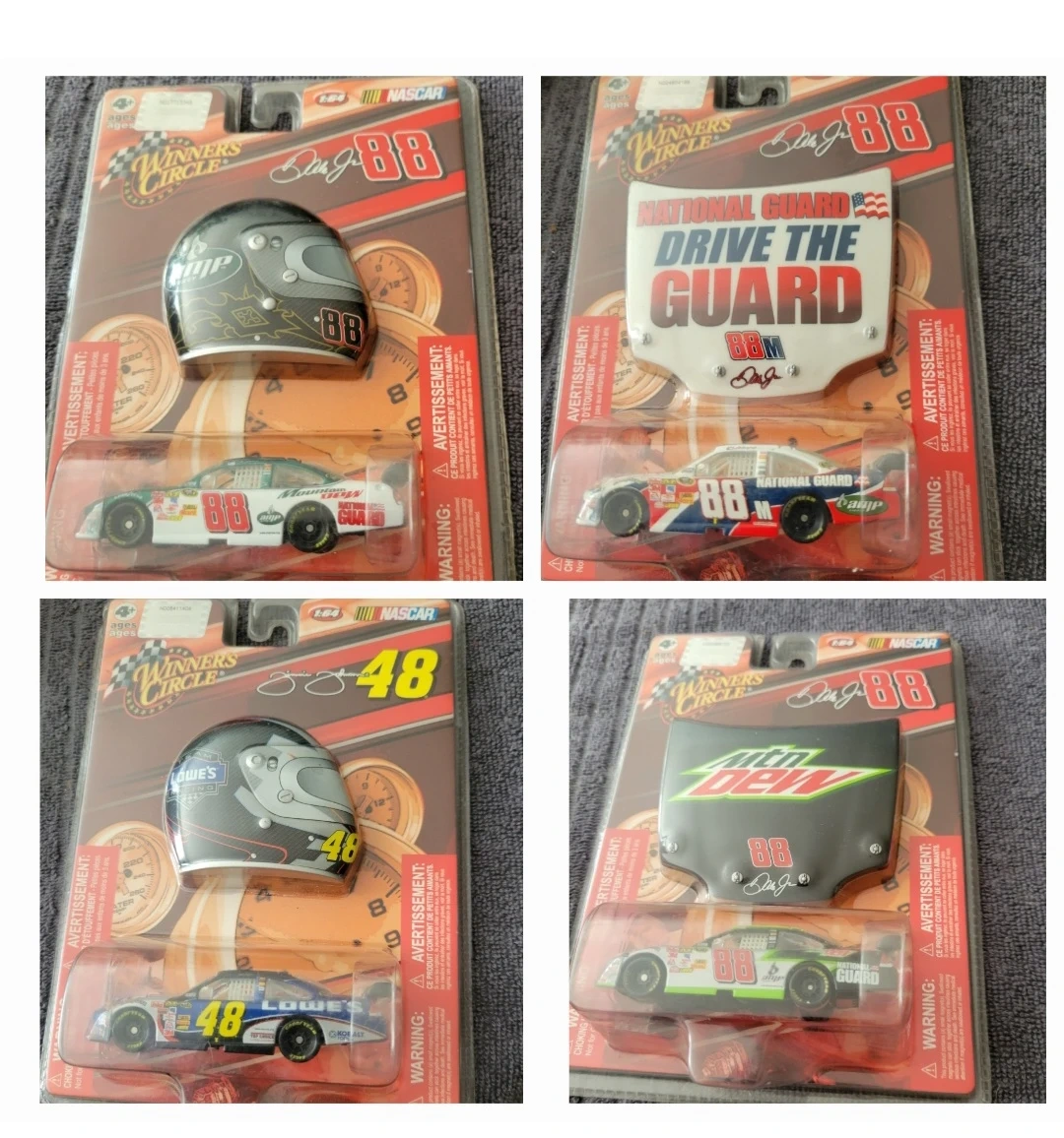 Four collectible 1:64 scale Winners Circle NASCAR diecast cars. Includes Jeff Gordon's #24 DuPont and National Guard cars, and Dale Earnhardt's #88 Amp Energy car. These are displayed in their original packaging.