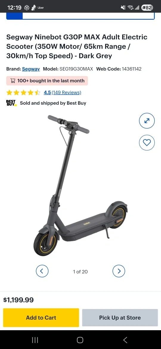Ninebot KickScooter MAX G30P electric scooter. It's a dark grey model with a 350W motor and a top speed of 30 km/h. This scooter offers a range of up to 65 km. It's built with a built-in front LED light and a dual brake system. This model is also IPX5 weather-resistant.