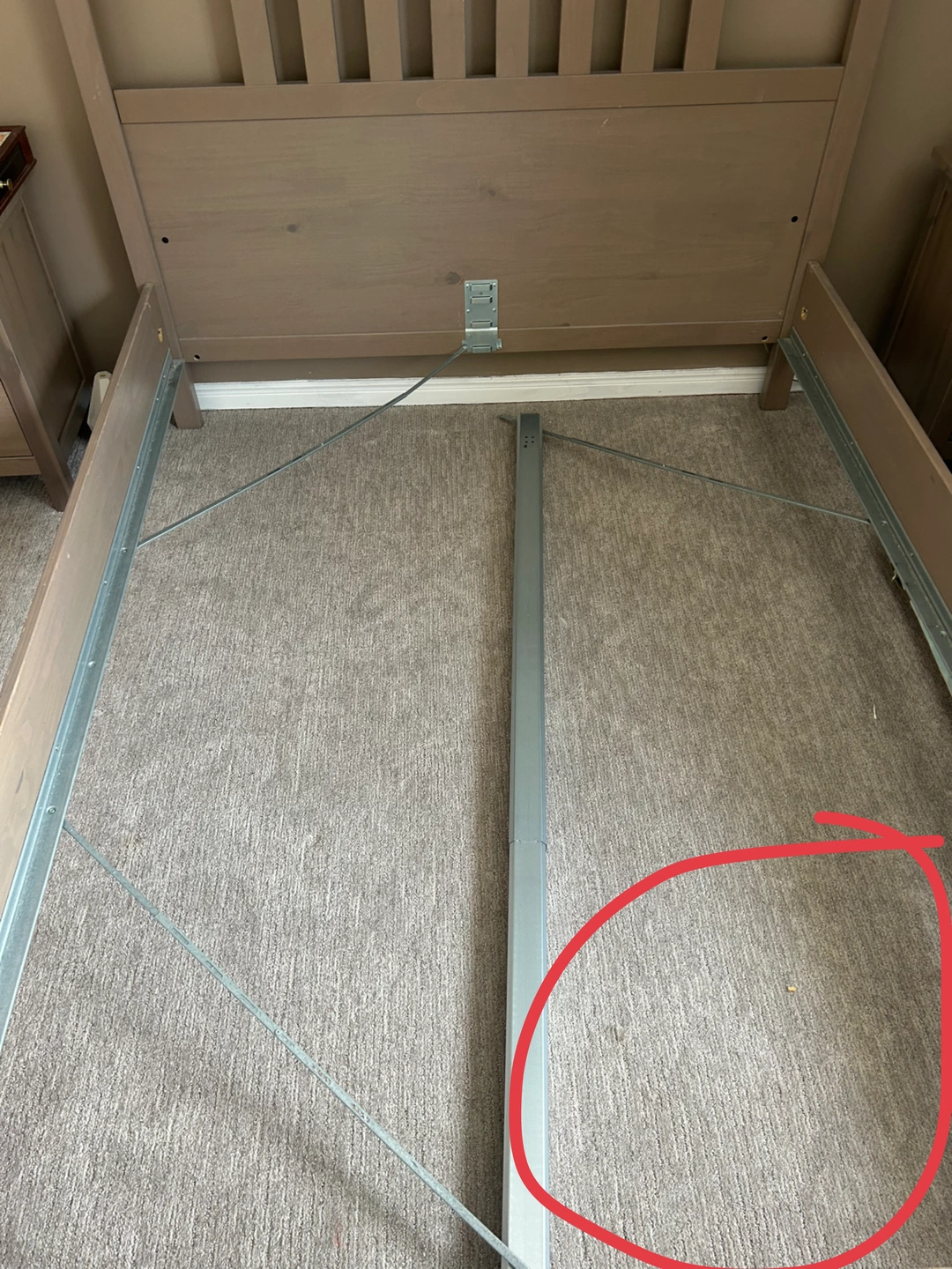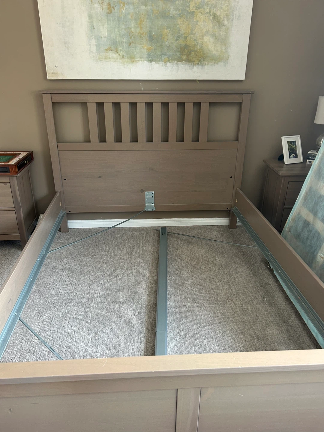 This is a wooden headboard and bed frame in a neutral taupe colour. It's a sturdy structure, ready for a mattress. Assembly is required.missing the piece highlighted in the picture. Was being used without and was sturdy. Picture was taken mid disassembly.