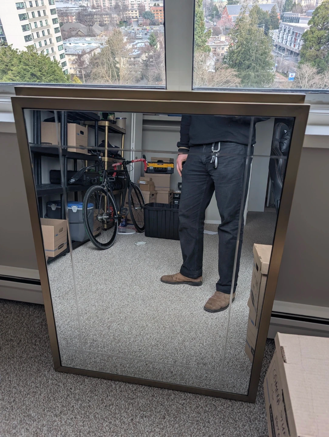 Large wall mirror with a thin metallic gold-toned frame. It's perfect for a hallway or entryway to add depth to your space. The frame has a modern, minimalist design.