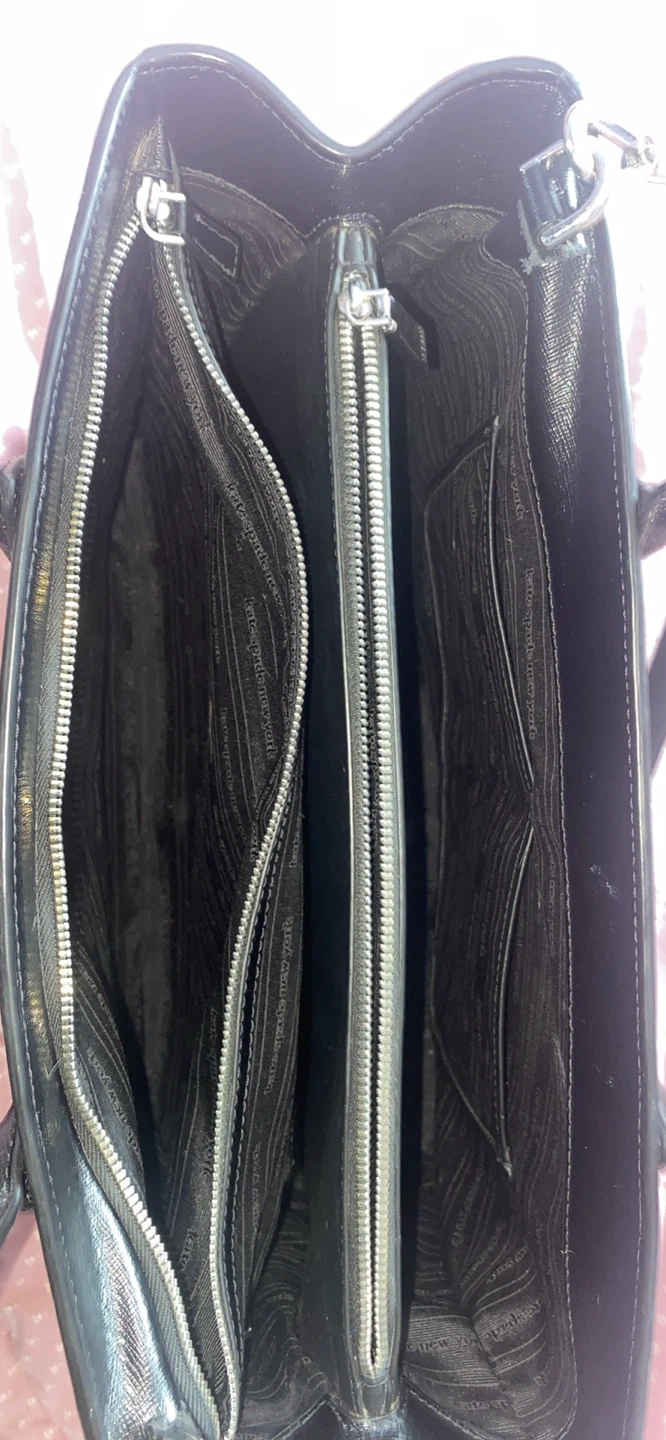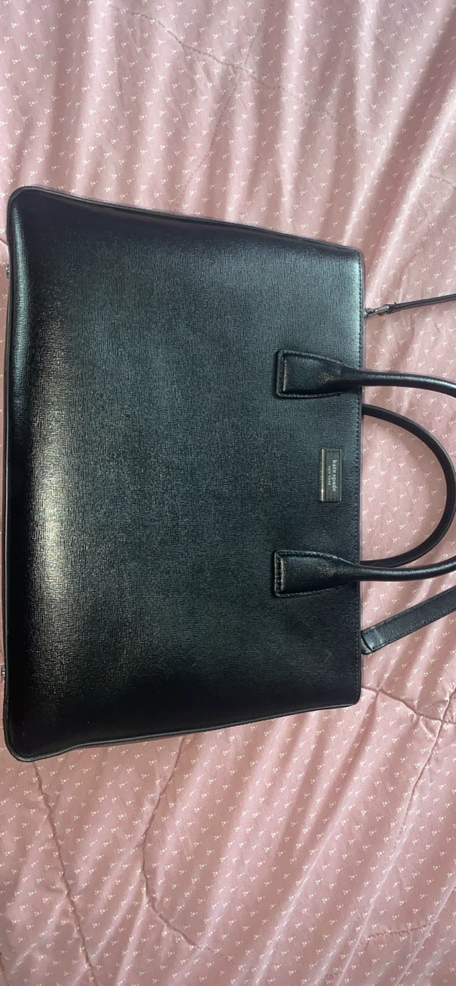 This is a black leather tote bag from Kate Spade New York. It features a textured leather exterior and a zippered main compartment with interior pockets. Includes a removable crossbody strap. Bag has protective metal feet on the bottom.