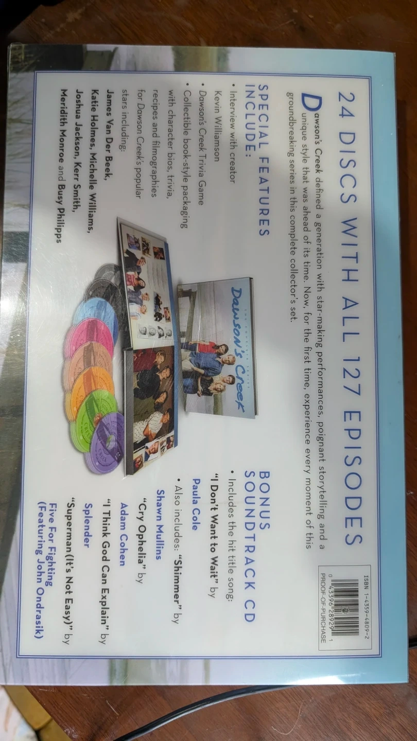 This is the complete series DVD box set for Dawson's Creek. It includes all 6 seasons and 24 discs. There are also new DVD extras and a bonus music CD included. This set contains all 127 episodes.