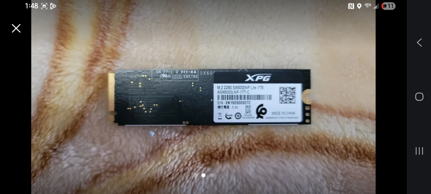 This is an XPG SX6000NP Lite 1TB NVMe M.2 SSD. It's a compact drive for fast storage. It's rated for DC 3.3V 2A.