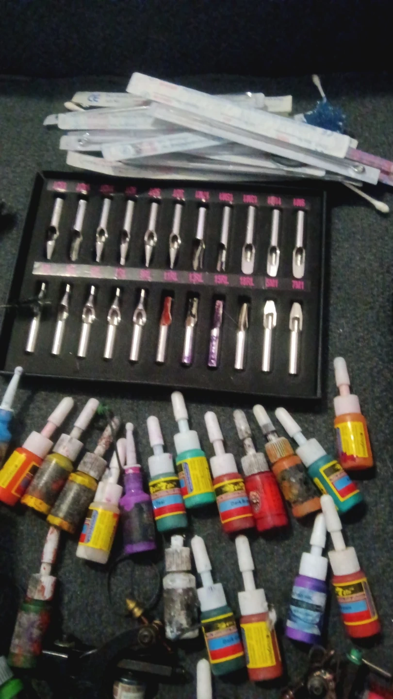 This listing includes two tattoo machines, a variety of ink bottles in different colours, and a set of tattoo needles. Additional tattoo tips are also included. It's a comprehensive kit for tattoo artists.