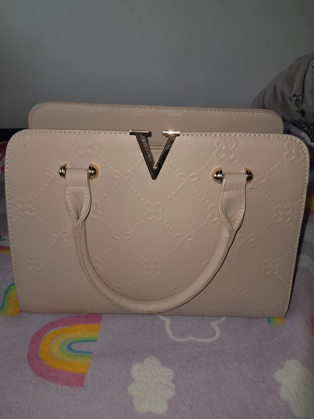 This beige top handle satchel handbag features a subtle embossed pattern and a "V" logo accent. It's made from faux leather and has multiple interior pockets for organization. A great everyday bag!