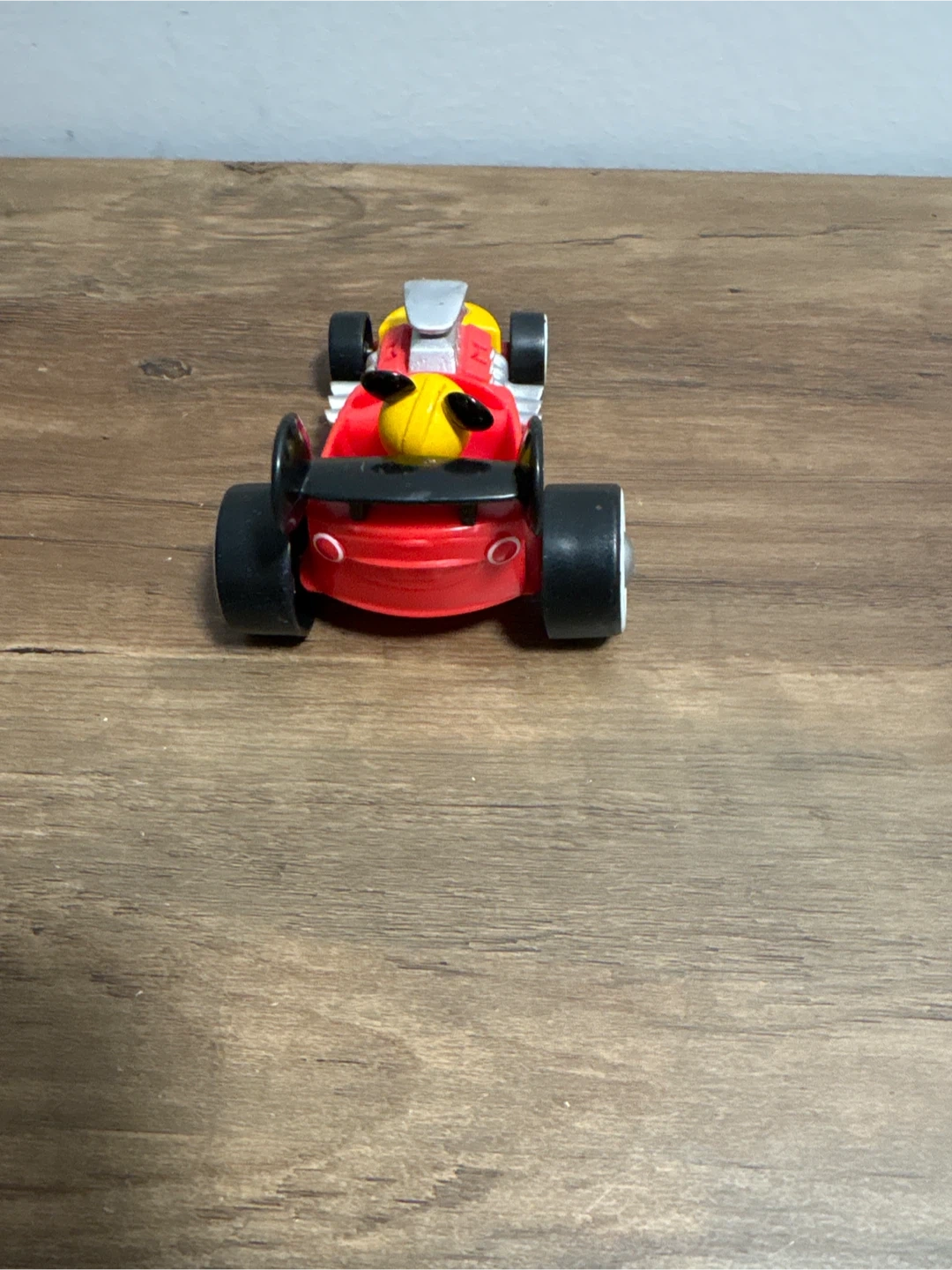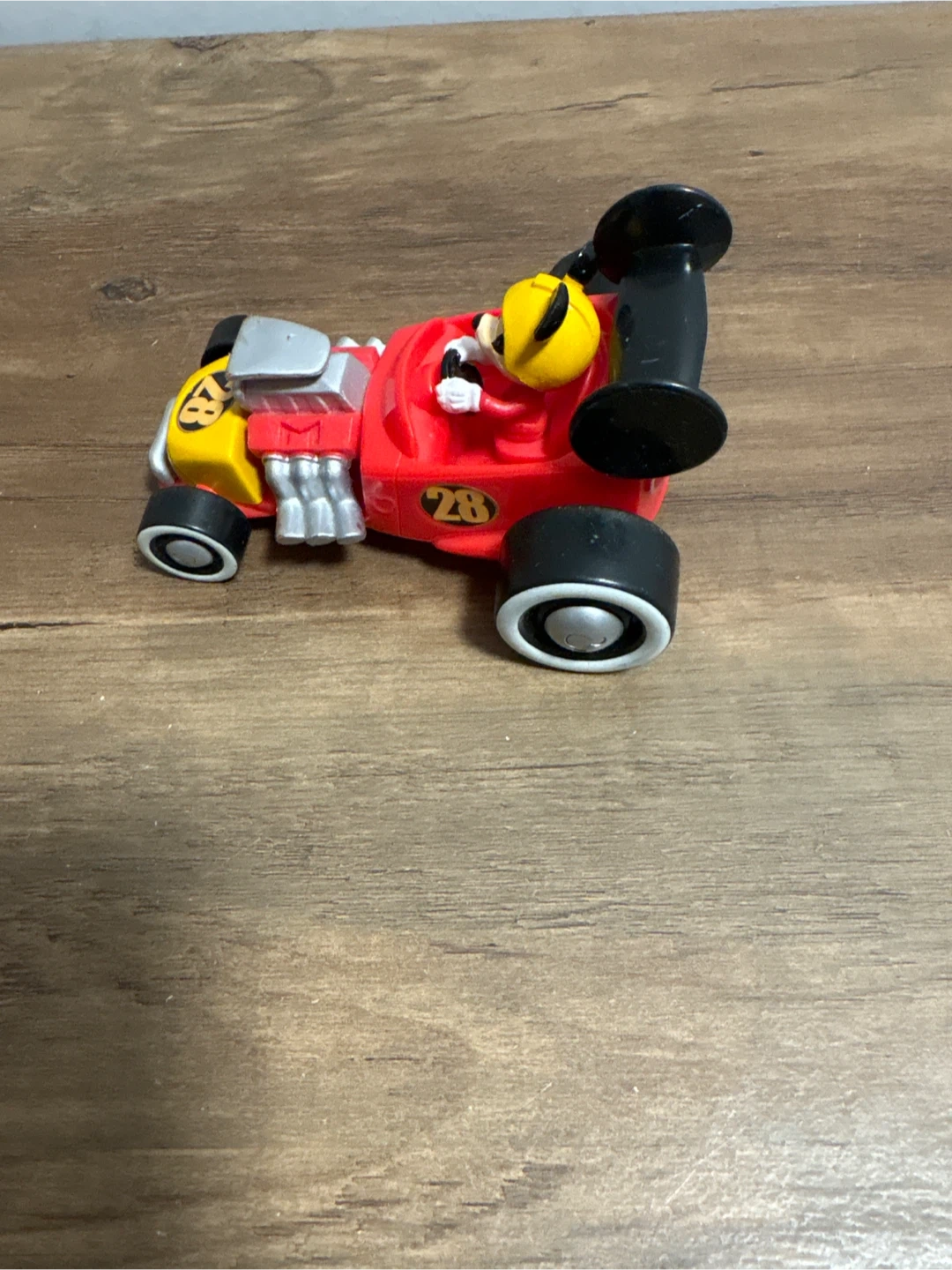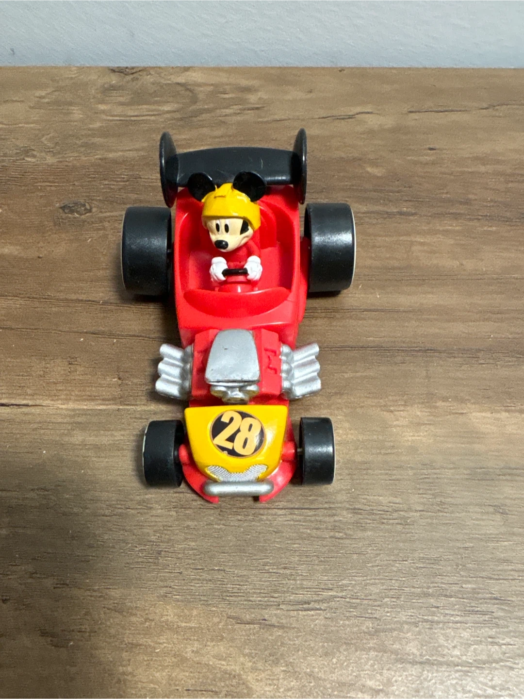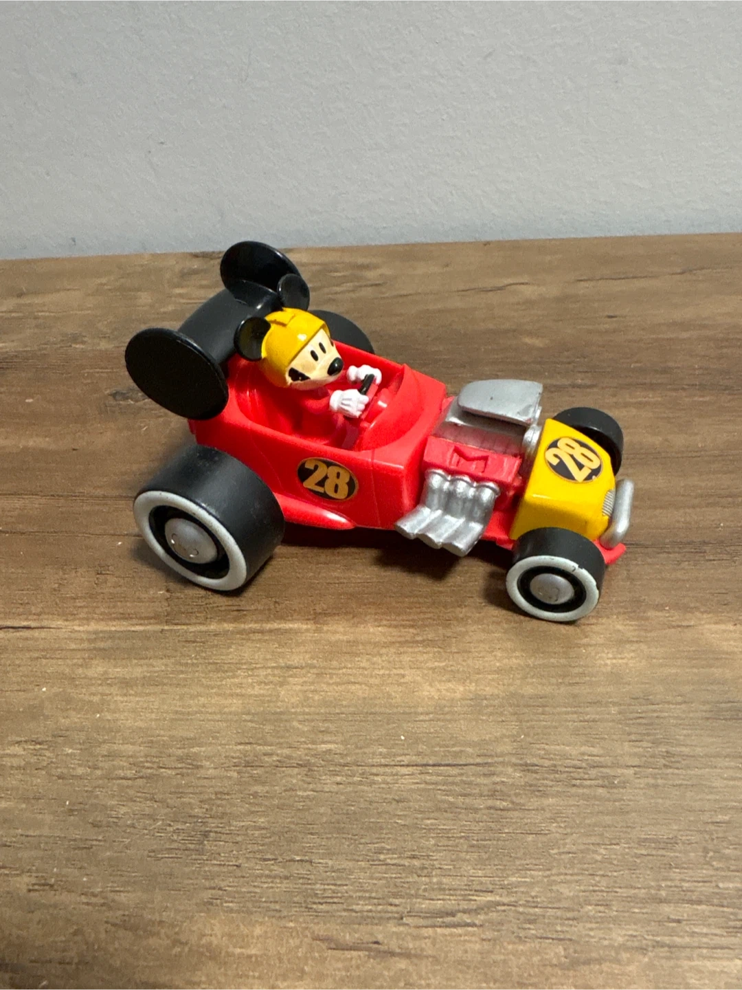 This is a fun Mickey Mouse race car toy. It features Mickey in the driver's seat with a yellow helmet and a red racing suit. The car itself is red with black racing tires and a yellow front with the number 28. It's a classic character collectible!