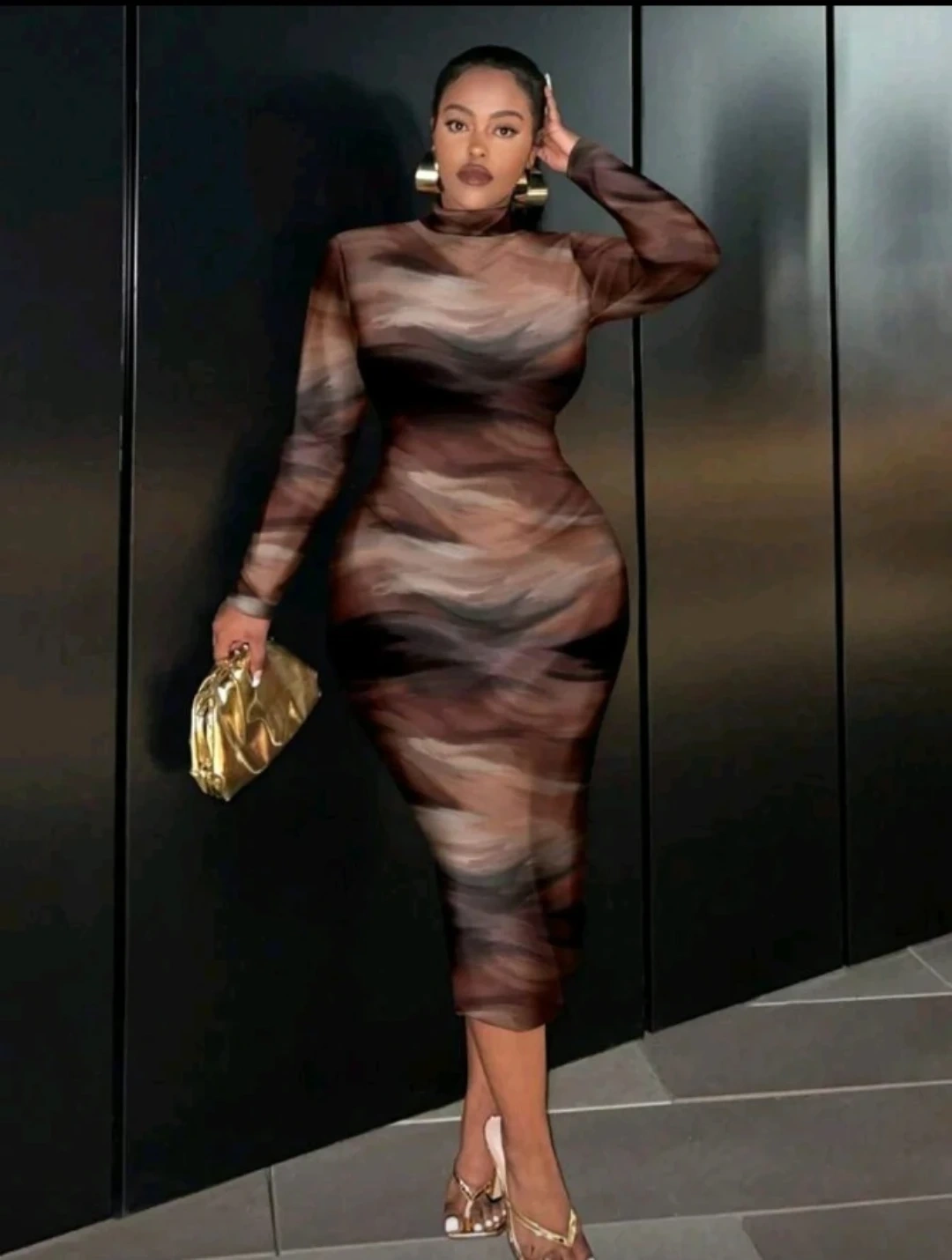 This long-sleeve dress features a mock neck and a bold abstract print. It's made from a sheer, stretchy fabric that drapes beautifully. The dress falls to a midi length.