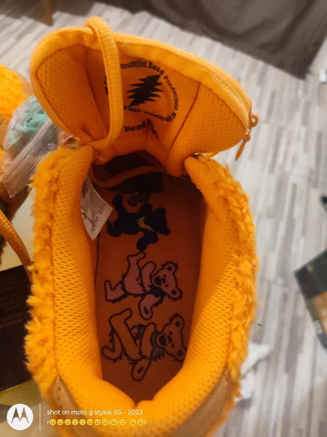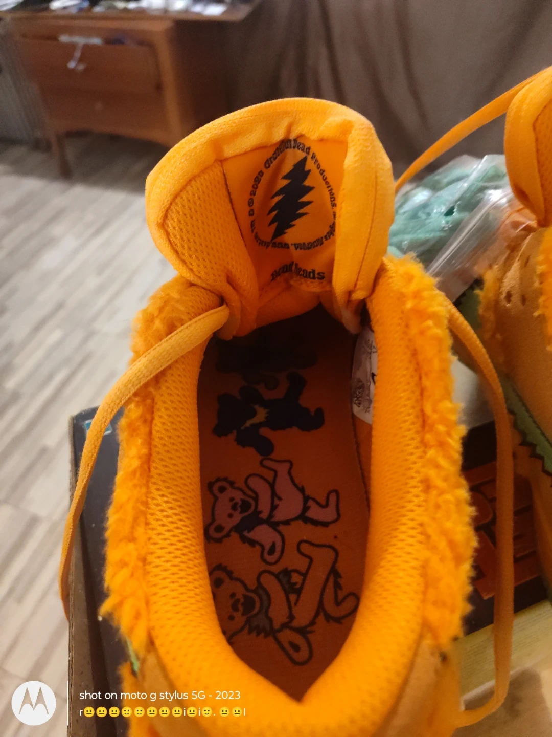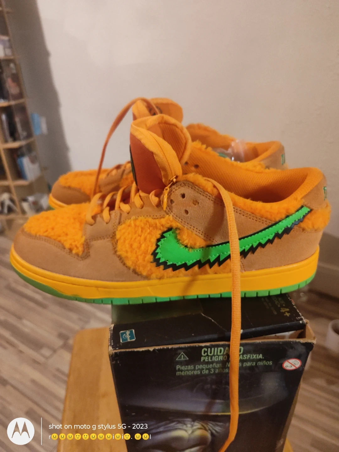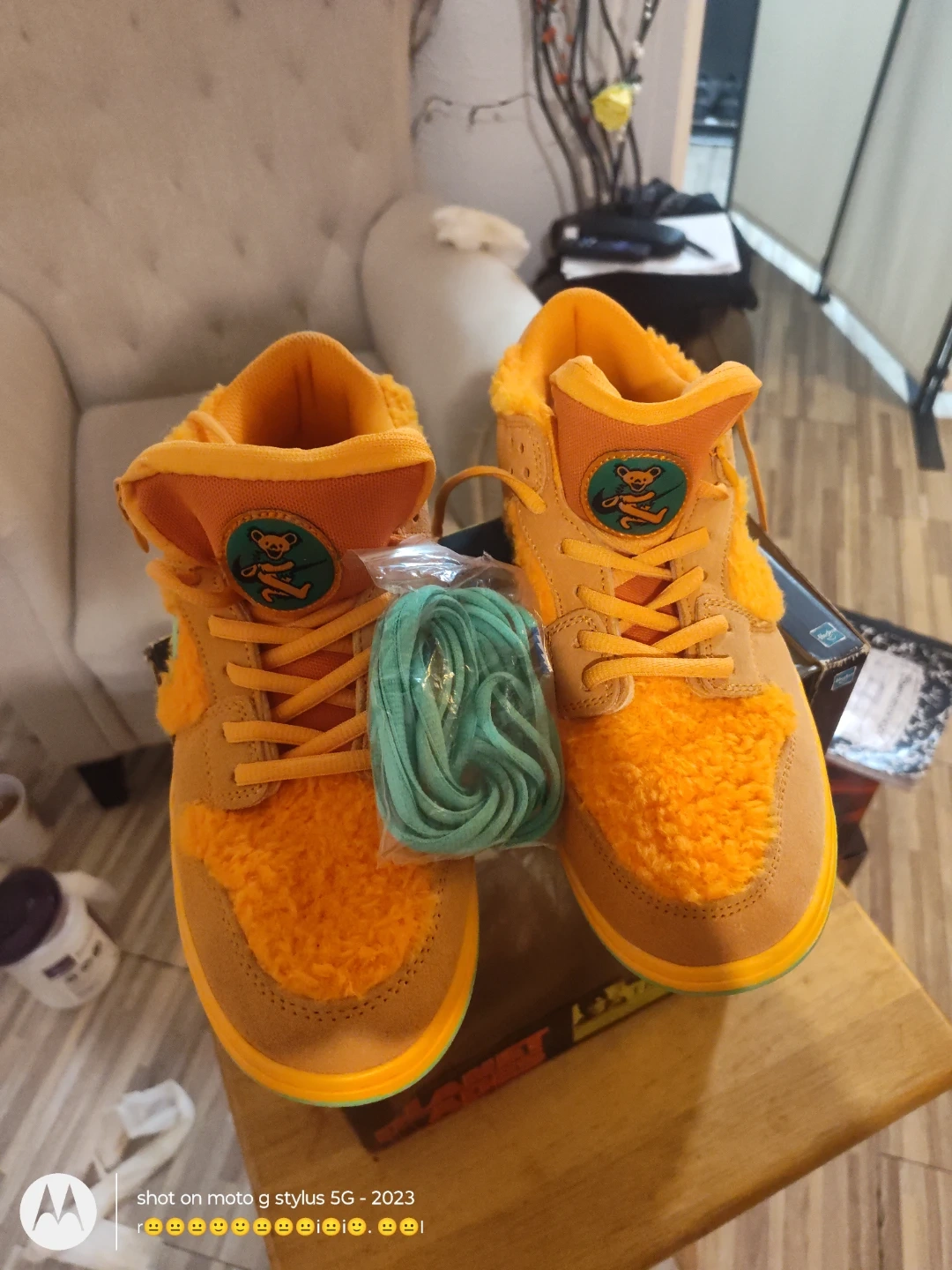 Nike SB Dunk Low Grateful Dead Bears. Orange fuzzy suede and leather. Includes extra green laces. These sneakers are a unique collectible for fans!
