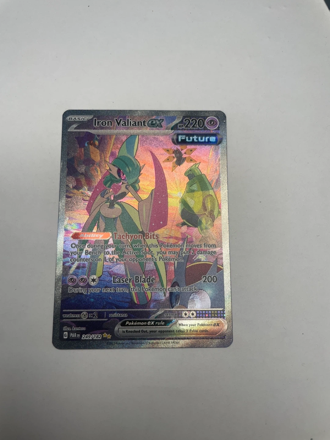 This is the Iron Valiant EX Pokemon trading card. It's a Future type card with 220 HP. It has the Tachyon Bits ability and Laser Blade attack.
