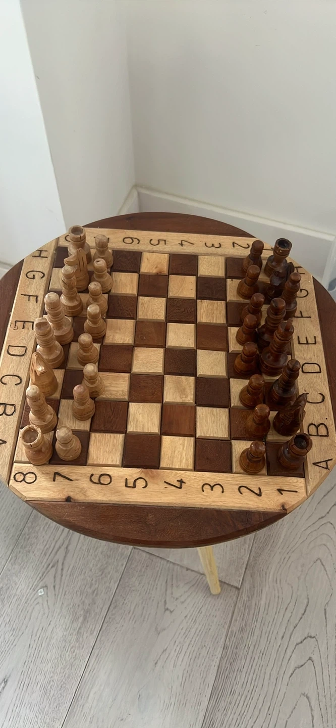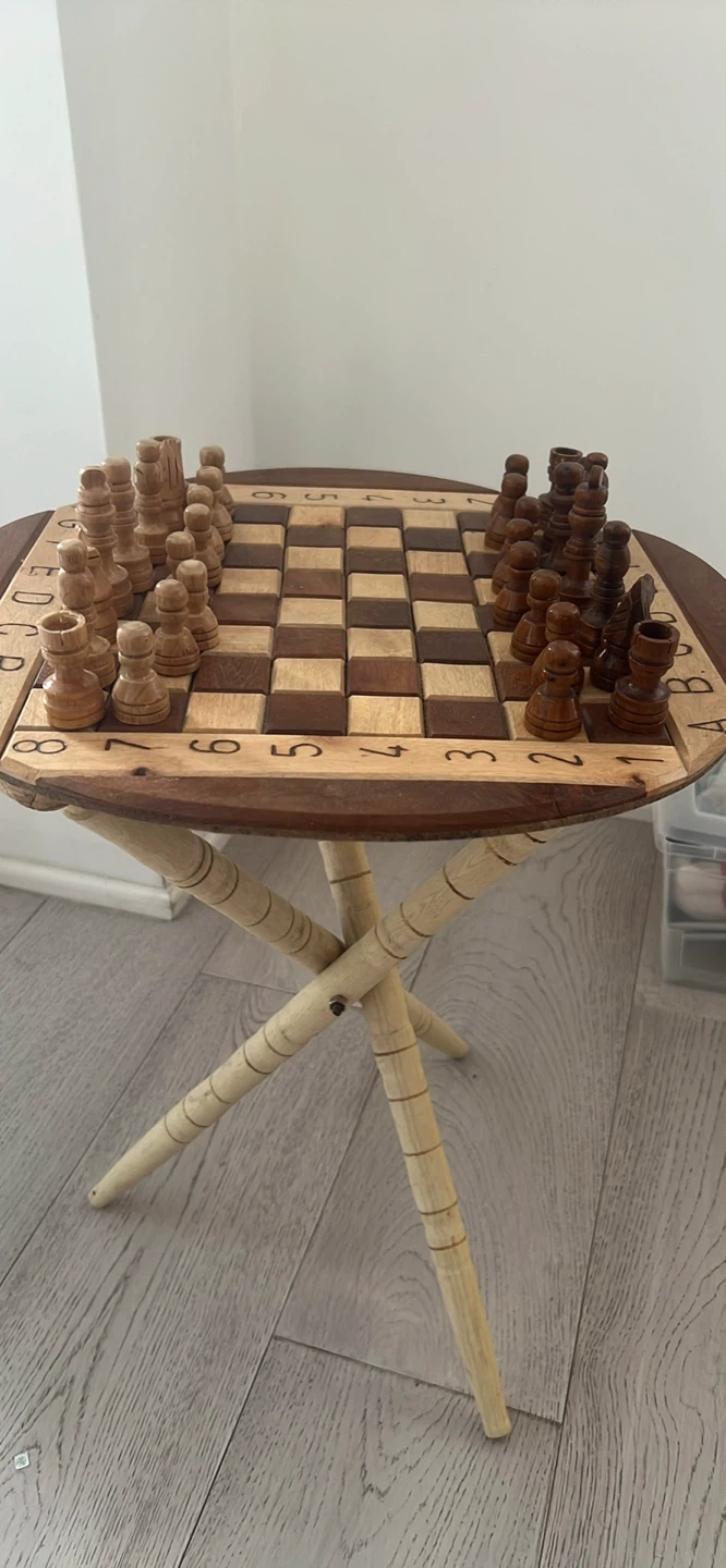This is a classic wooden chess set with a folding board. It's perfect for bringing along on trips or for playing at home. The set includes all the pieces needed for a game. A great choice for chess enthusiasts of all ages!