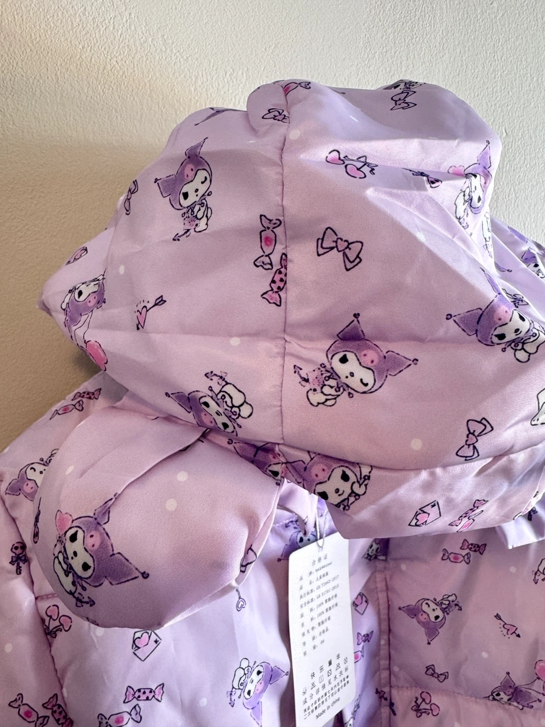 This adorable puffer jacket features a cute Kuromi print all over in a fun purple shade. It's fully lined for extra warmth. Perfect for keeping little ones cozy on chilly days!