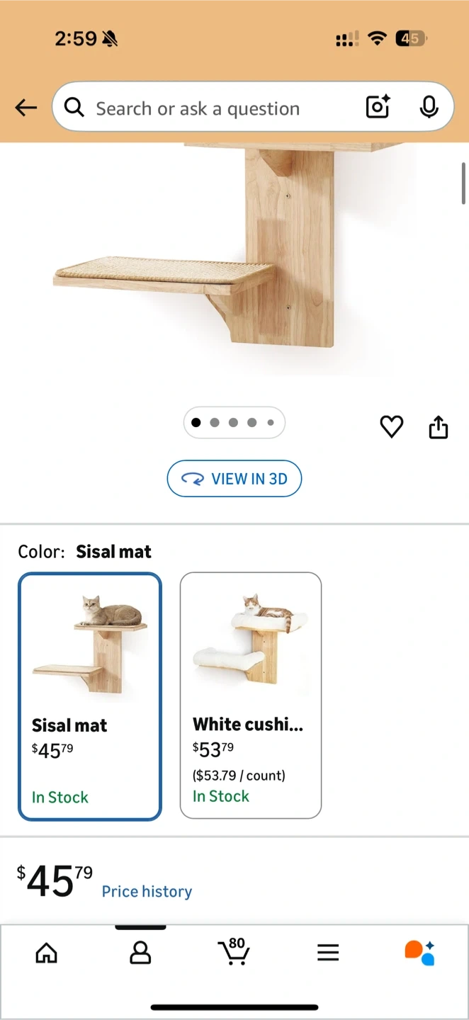 This wall-mounted cat shelf is made of natural wood. It features two levels with sisal matting for climbing and resting. Easy to attach to your wall for your feline friend's enjoyment!